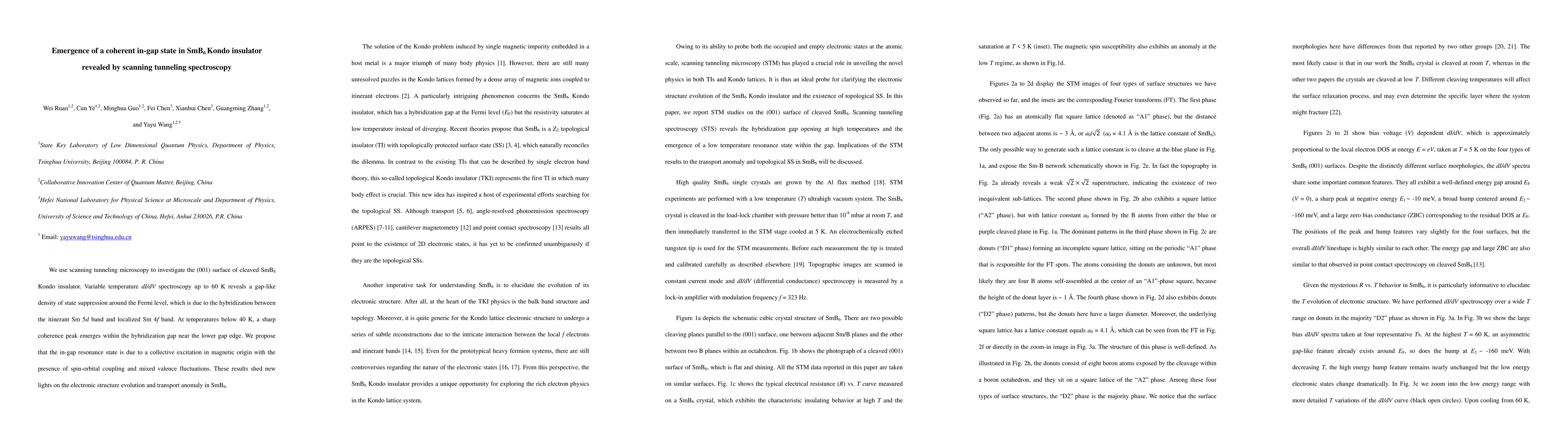 This study reveals a coherent in-gap state in SmB6 Kondo insulator using scanning tunneling spectroscopy, showing a gap-like suppression around the Fermi level due to hybridization between itinerant and localized Sm bands. Below 40 K, a coherence peak emerges, suggesting a magnetic origin linked to spin-orbital coupling and mixed valence fluctuations.