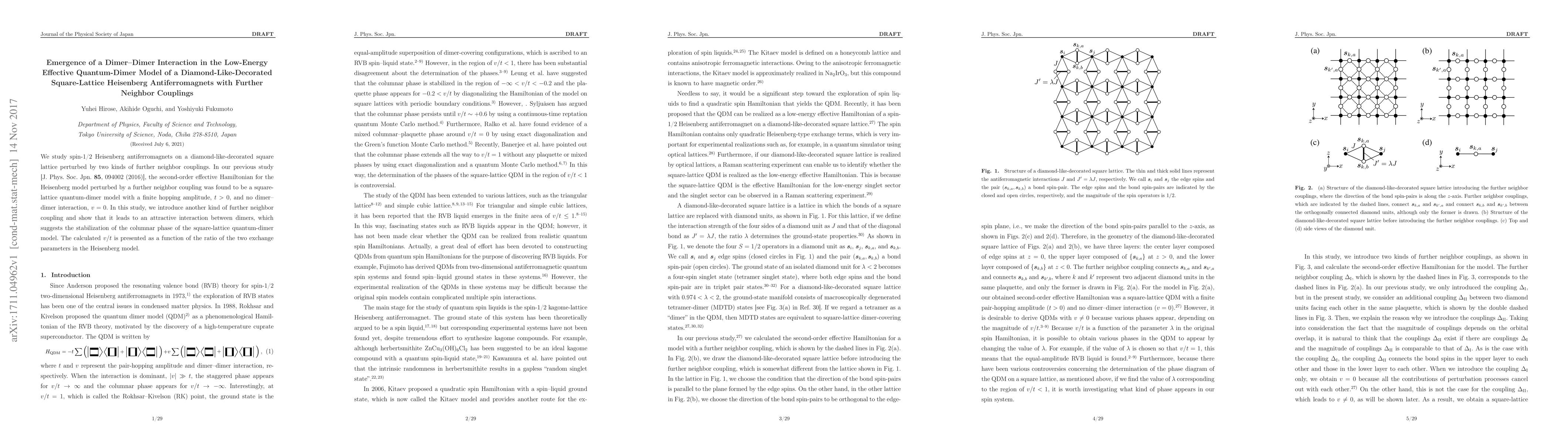 This paper investigates spin-1/2 Heisenberg antiferromagnets on a diamond-like-decorated square lattice with additional further neighbor couplings, revealing a dimer-dimer interaction that stabilizes the columnar phase in the quantum-dimer model. The study finds an attractive interaction between dimers, quantified by v/t, as a function of the ratio of the exchange parameters.