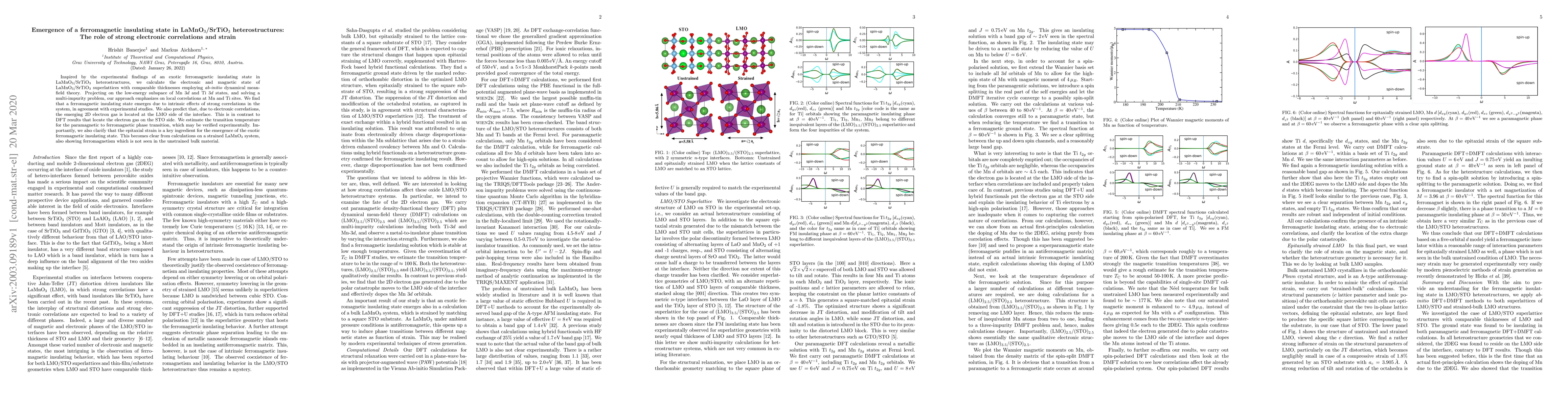 The research demonstrates the emergence of a ferromagnetic insulating state in LaMnO$_3$/SrTiO$_3$ heterostructures driven by strong electronic correlations and strain, verified via ab-initio dynamical mean-field theory, with a predicted 2D electron gas on the LMO side, contrasting DFT predictions.