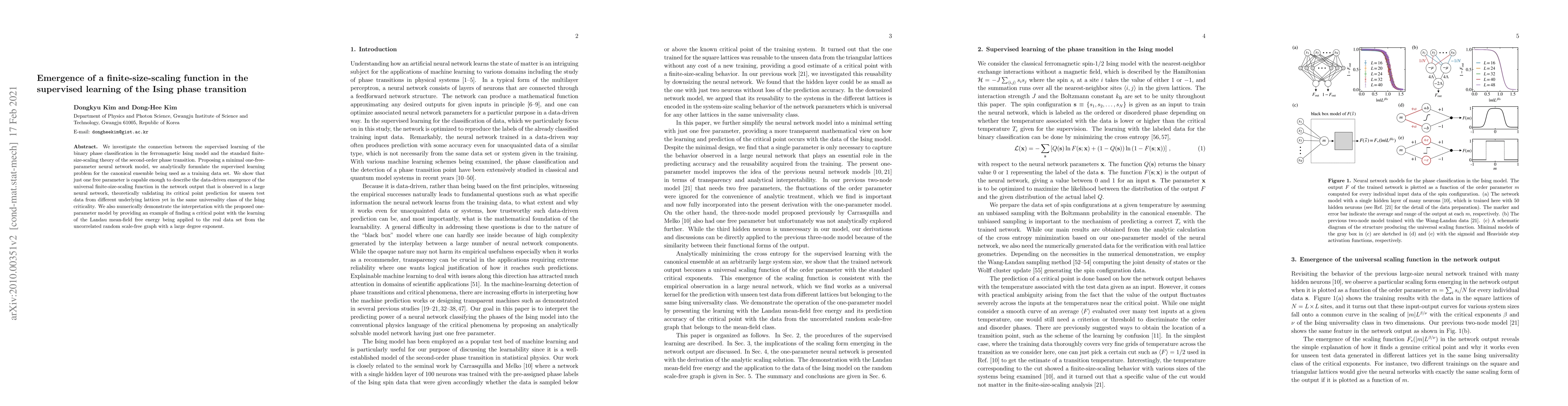 We investigate the connection between the supervised learning of the binary phase classification in the ferromagnetic Ising model and the standard finite-size-scaling theory of the second-order phase transition. Proposing a minimal one-free-parameter neural network model, we analytically formulate the supervised learning problem for the canonical ensemble being used as a training data set. We show that just one free parameter is capable enough to describe the data-driven emergence of the universal finite-size-scaling function in the network output that is observed in a large neural network, theoretically validating its critical point prediction for unseen test data from different underlying lattices yet in the same universality class of the Ising criticality. We also numerically demonstrate the interpretation with the proposed one-parameter model by providing an example of finding a critical point with the learning of the Landau mean-field free energy being applied to the real data set from the uncorrelated random scale-free graph with a large degree exponent.