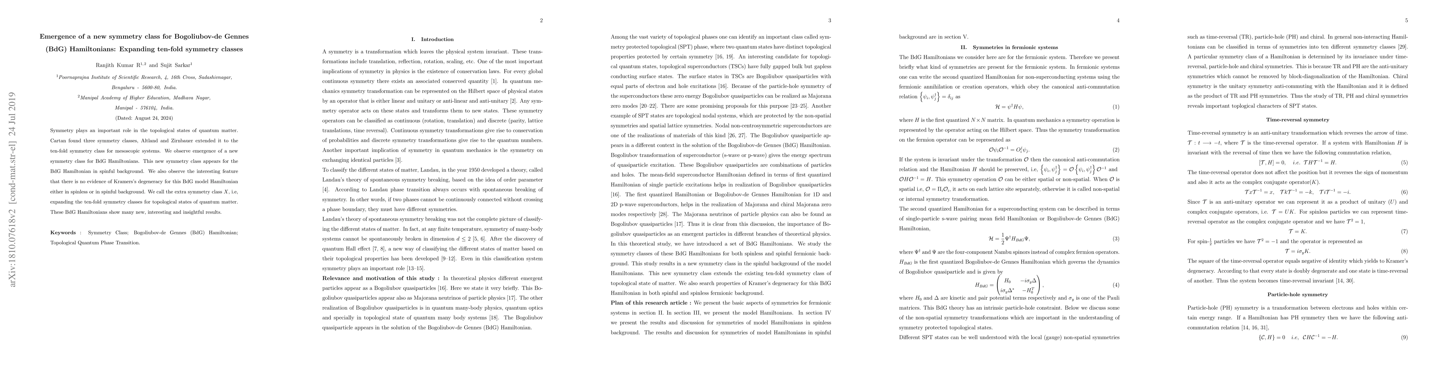 Symmetry plays an important role in the topological states of quantum matter. Cartan found three symmetry classes, Altland and Zirnbauer extended it to the ten-fold symmetry class for mesoscopic systems. We observe emergence of a new symmetry class for BdG Hamiltonians. This new symmetry class appears for the BdG Hamiltonian in spinful background. We also observe the interesting feature that there is no evidence of Kramers's degeneracy for this BdG model Hamiltonian either in spinless or in spinful background. We call the extra symmetry class X, i.e, expanding the ten-fold symmetry classes for topological states of quantum matter. These BdG show many new, interesting and insightful results.