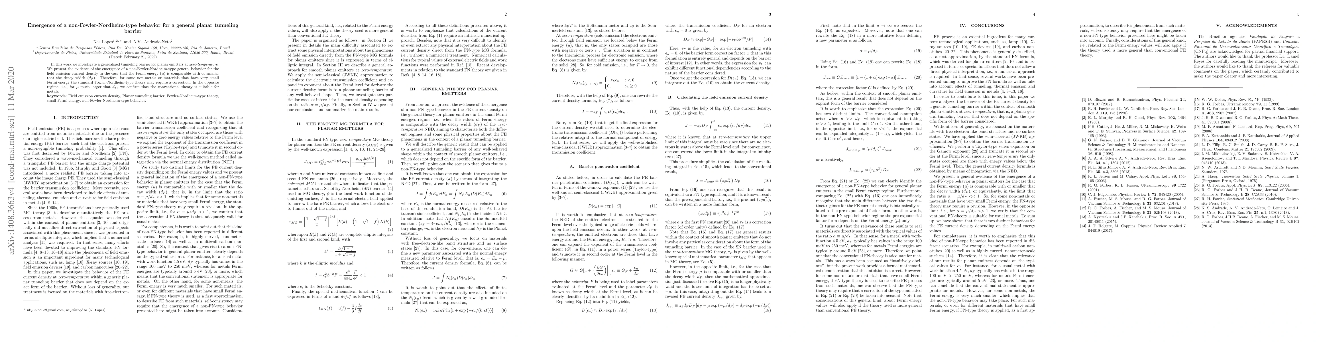 In this work we investigate a generalized tunneling barrier for planar emitters at zero-temperature. We present the evidence of the emergence of a non-Fowler-Nordheim-type general behavior for the field emission current density in the case that the Fermi energy ($\mu$) is comparable with or smaller that the decay width ($d_F$). Therefore, for some non-metals or materials that have very small Fermi energy the standard Fowler-Nordheim-type theory may require a correction. In the opposite regime, i.e., for $\mu$ much larger that $d_F$, we confirm that the conventional theory is suitable for metals.