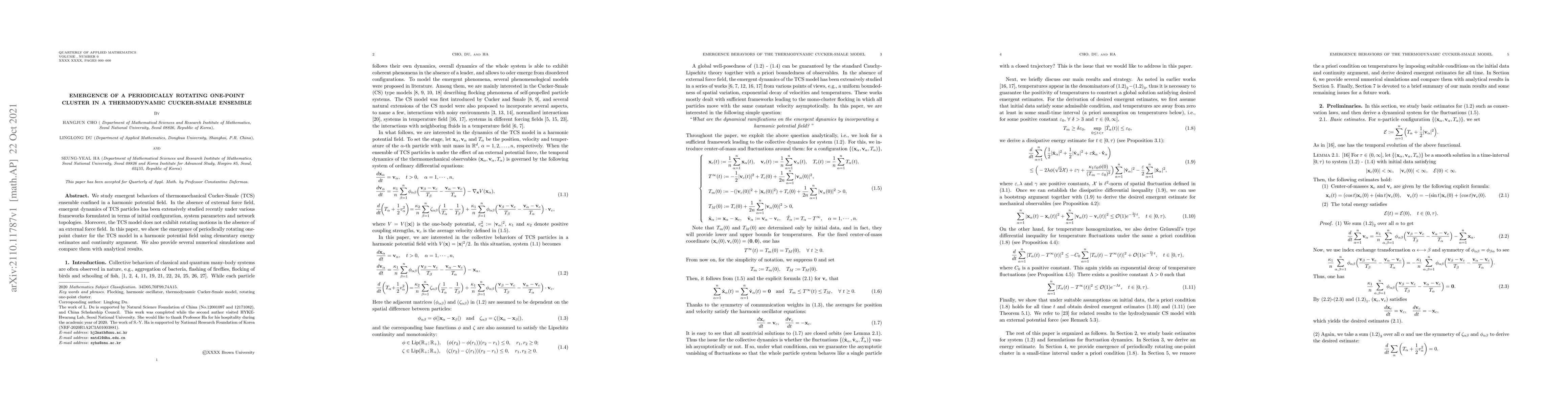 Researchers discovered a periodic rotation in clusters of thermomechanical Cucker-Smale particles confined to a harmonic potential field, a phenomenon not previously observed in the model.