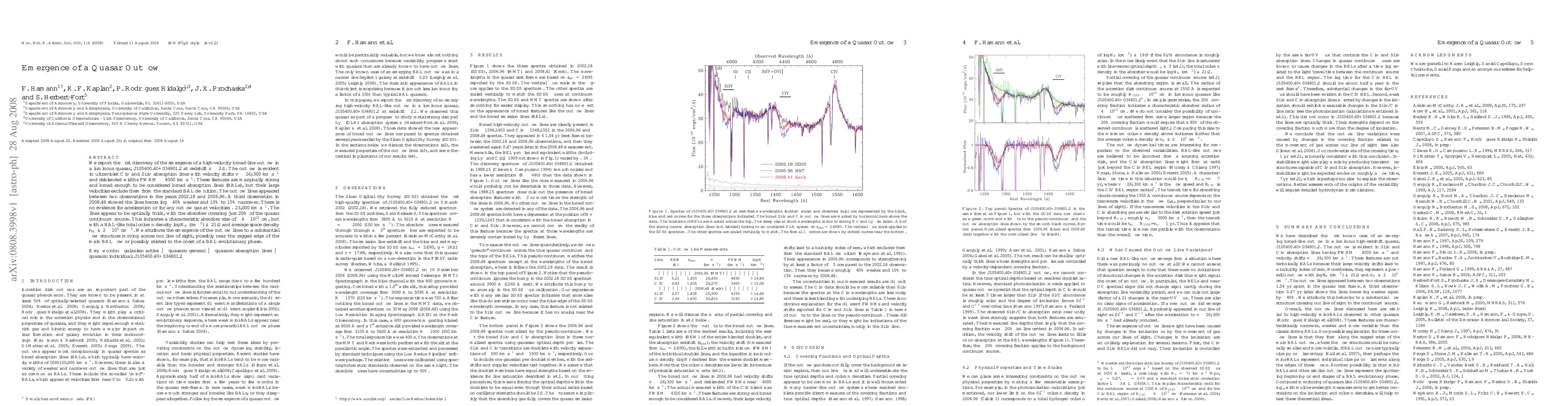 The research utilized spectroscopic observations of the quasar J105400.40+034801.2 over a period of approximately 4.5 years, analyzing changes in ultraviolet CIV and SiIV absorption lines to identify the emergence of a high-velocity outflow.