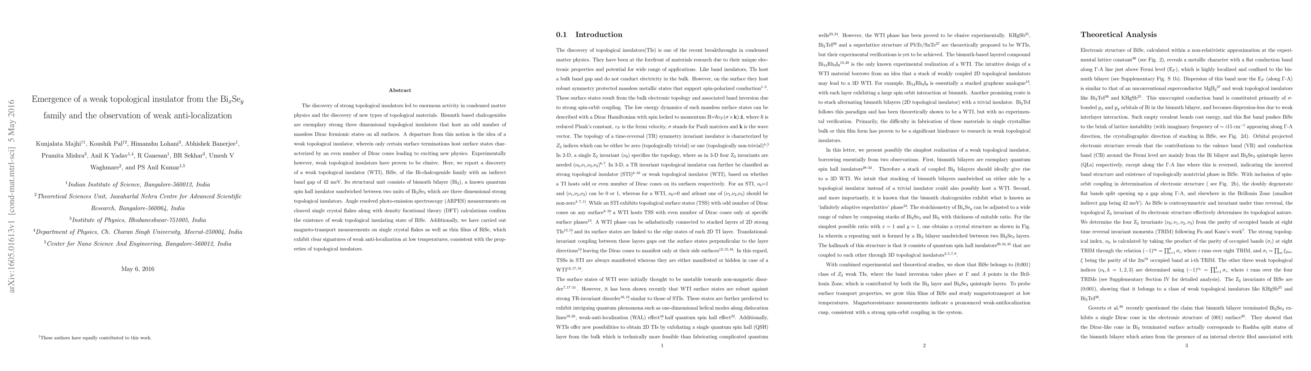 The paper reports the discovery of a weak topological insulator, BiSe, from the Bi-chalcogenide family, confirmed by ARPES and DFT calculations, alongside weak anti-localization observed in magneto-transport measurements, marking a significant advancement in topological materials research.