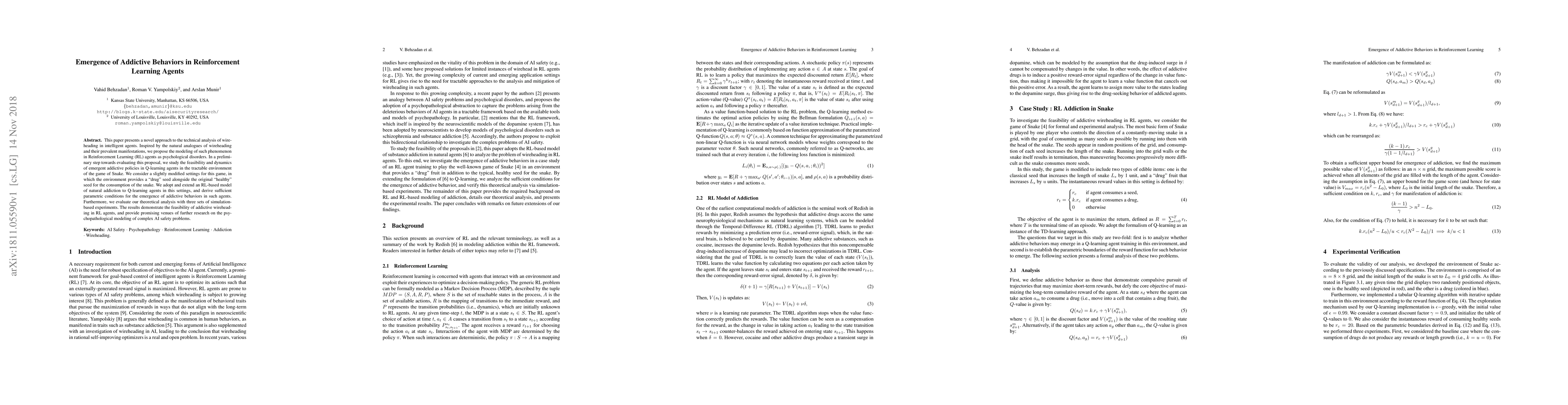 This paper models wireheading in Reinforcement Learning agents as psychological disorders, studying emergent addictive behaviors in Q-learning agents through modified Snake game simulations, demonstrating the feasibility of such behaviors and suggesting pathways for further AI safety research.