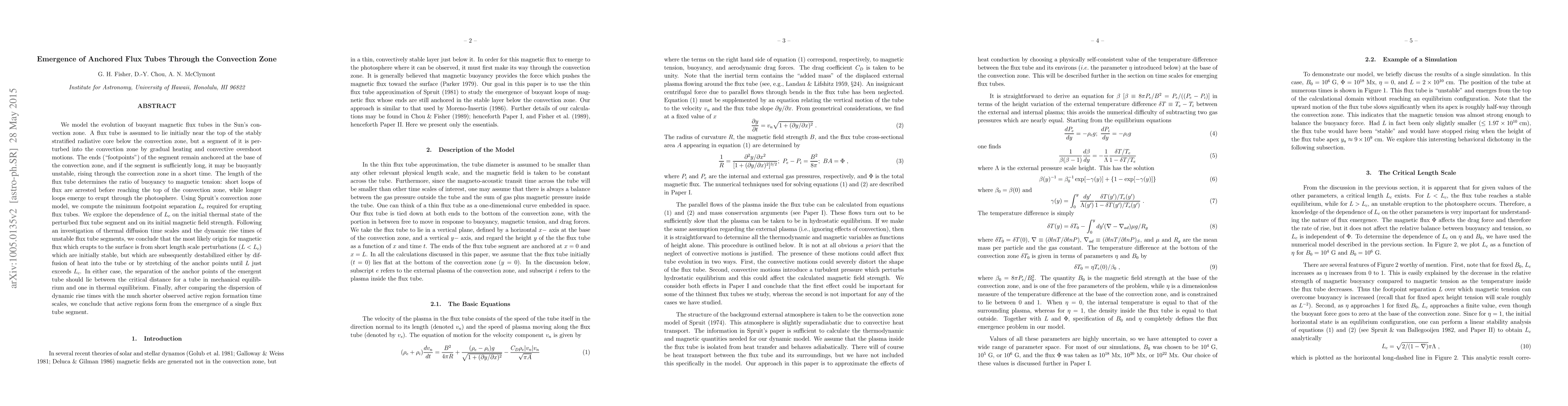 This paper models the evolution of buoyant magnetic flux tubes in the Sun's convection zone, finding that short flux tubes are arrested while longer ones erupt through the photosphere. The study determines the critical footpoint separation required for eruption and concludes that active regions form from the emergence of a single flux tube segment.