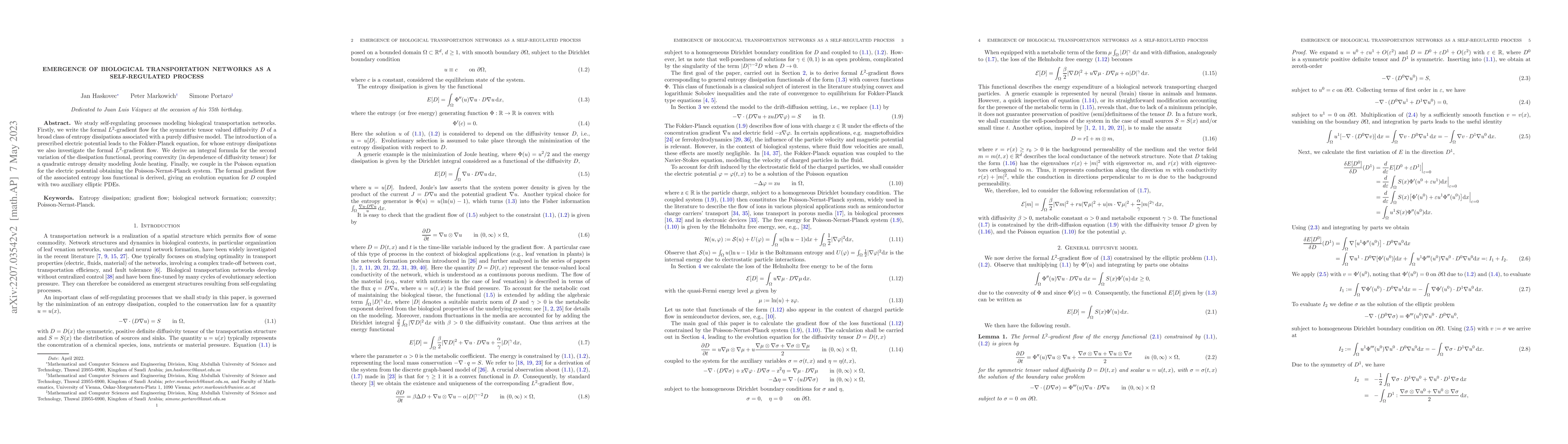 We study self-regulating processes modeling biological transportation networks. Firstly, we write the formal $L^2$-gradient flow for the symmetric tensor valued diffusivity $D$ of a broad class of entropy dissipations associated with a purely diffusive model. The introduction of a prescribed electric potential leads to the Fokker-Planck equation, for whose entropy dissipations we also investigate the formal $L^2$-gradient flow. We derive an integral formula for the second variation of the dissipation functional, proving convexity (in dependence of diffusivity tensor) for a quadratic entropy density modeling Joule heating. Finally, we couple in the Poisson equation for the electric potential obtaining the Poisson-Nernst-Planck system. The formal gradient flow of the associated entropy loss functional is derived, giving an evolution equation for $D$ coupled with two auxiliary elliptic PDEs.