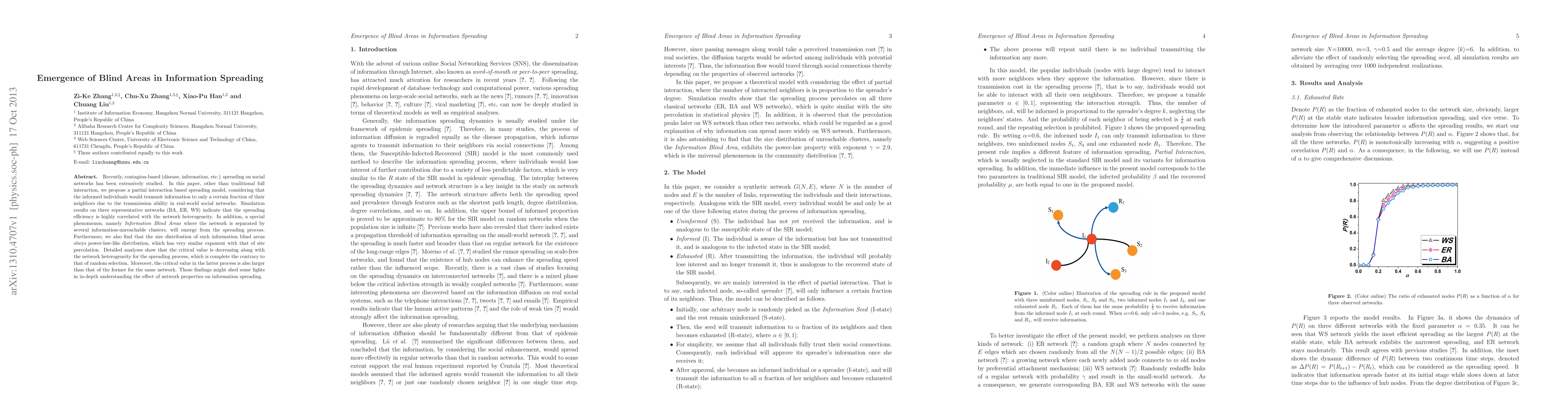 This paper proposes a partial interaction model for information spreading on social networks, showing that spreading efficiency correlates with network heterogeneity. It identifies "Information Blind Areas," clusters that remain unreachable by information, with sizes following a power-law distribution, and finds that network heterogeneity decreases the critical value for complete spreading.