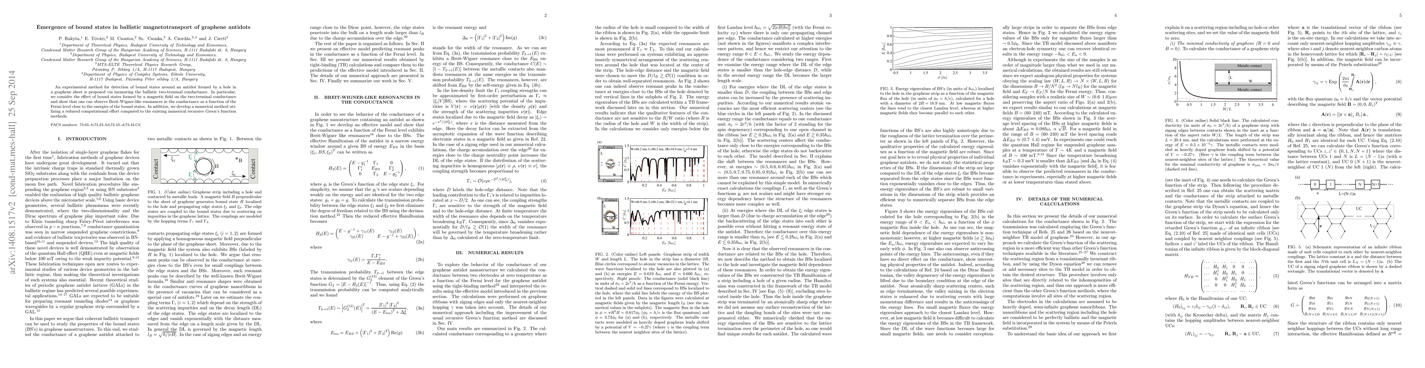 An experimental method for detection of bound states around an antidot formed from a hole in a graphene sheet is proposed by measuring the ballistic two terminal conductances. In particularly, we consider the effect of bound states formed by magnetic field on the two terminal conductance and show that one can observe Breit-Wigner like resonances in the conductance as a function of the Fermi level close to the energies of the bound states. In addition, we develop a new numerical method in which the computational effort is proportional to the linear dimensions, instead of the area of the scattering region beeing typical for the existing numerical recursive Green's function method.