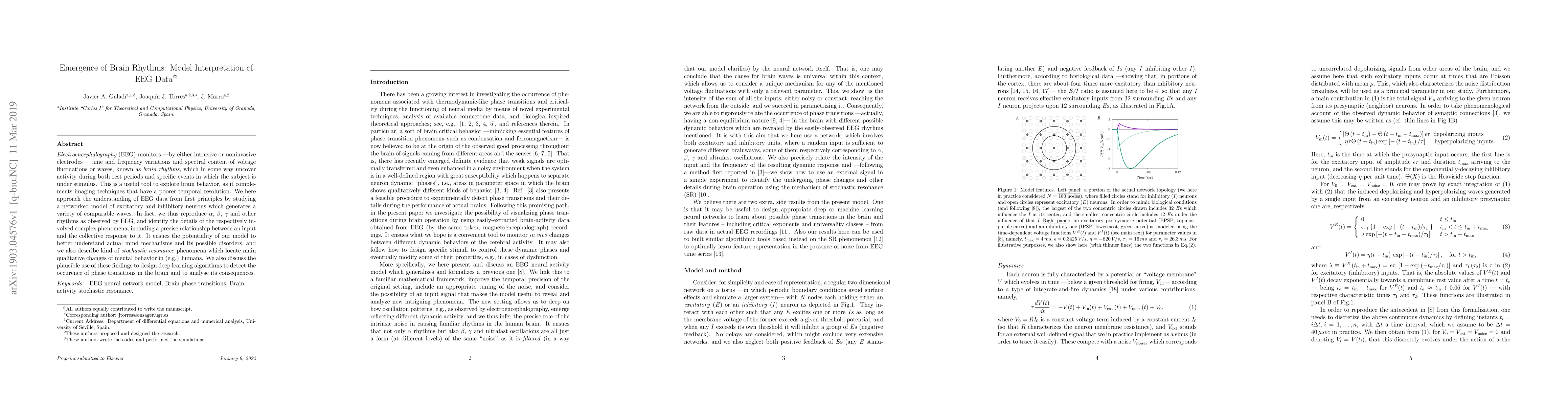 Electroencephalography (EEG) monitors ---by either intrusive or noninvasive electrodes--- time and frequency variations and spectral content of voltage fluctuations or waves, known as brain rhythms, which in some way uncover activity during both rest periods and specific events in which the subject is under stimulus. This is a useful tool to explore brain behavior, as it complements imaging techniques that have a poorer temporal resolution. We here approach the understanding of EEG data from first principles by studying a networked model of excitatory and inhibitory neurons which generates a variety of comparable waves. In fact, we thus reproduce $\alpha$, $\beta,$ $\gamma$ and other rhythms as observed by EEG, and identify the details of the respectively involved complex phenomena, including a precise relationship between an input and the collective response to it. It ensues the potentiality of our model to better understand actual mind mechanisms and its possible disorders, and we also describe kind of stochastic resonance phenomena which locate main qualitative changes of mental behavior in (e.g.) humans. We also discuss the plausible use of these findings to design deep learning algorithms to detect the occurence of phase transitions in the brain and to analyse its consequences.