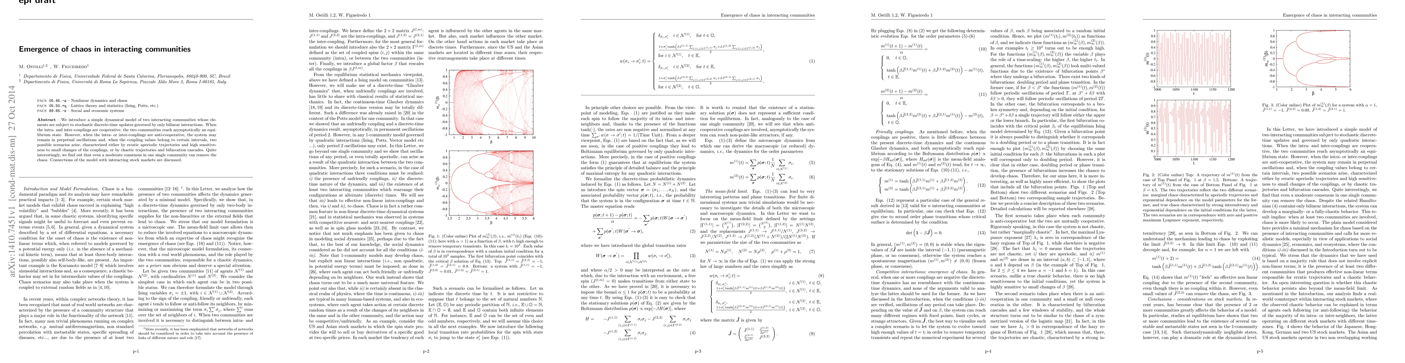 We introduce a simple dynamical model of two interacting communities whose elements are subject to stochastic discrete-time updates governed by only bilinear interactions. When the intra- and inter-couplings are cooperative, the two communities reach asymptotically an equilibrium state. However, when the intra- or inter-couplings are anti-cooperative, the system may remain in perpetual oscillations and, when the coupling values belong to certain intervals, two possible scenarios arise, characterized either by erratic aperiodic trajectories and high sensitiveness to small changes of the couplings, or by chaotic trajectories and bifurcation cascades. Quite interestingly, we find out that even a moderate consensus in one single community can remove the chaos. Connections of the model with interacting stock markets are discussed.