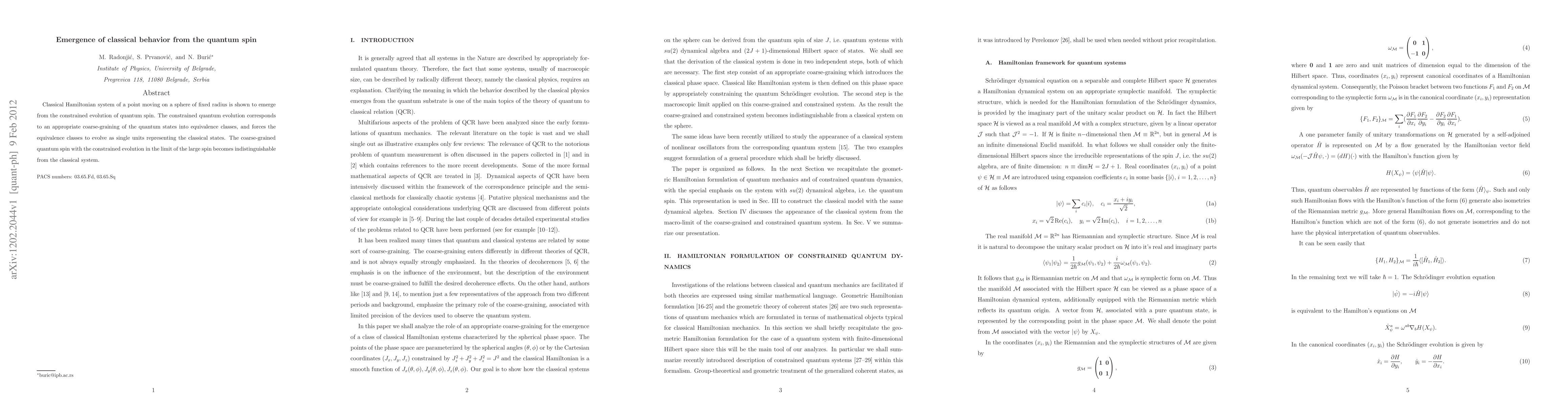 Classical Hamiltonian system of a point moving on a sphere of fixed radius is shown to emerge from the constrained evolution of quantum spin. The constrained quantum evolution corresponds to an appropriate coarse-graining of the quantum states into equivalence classes, and forces the equivalence classes to evolve as single units representing the classical states. The coarse-grained quantum spin with the constrained evolution in the limit of the large spin becomes indistinguishable from the classical system.