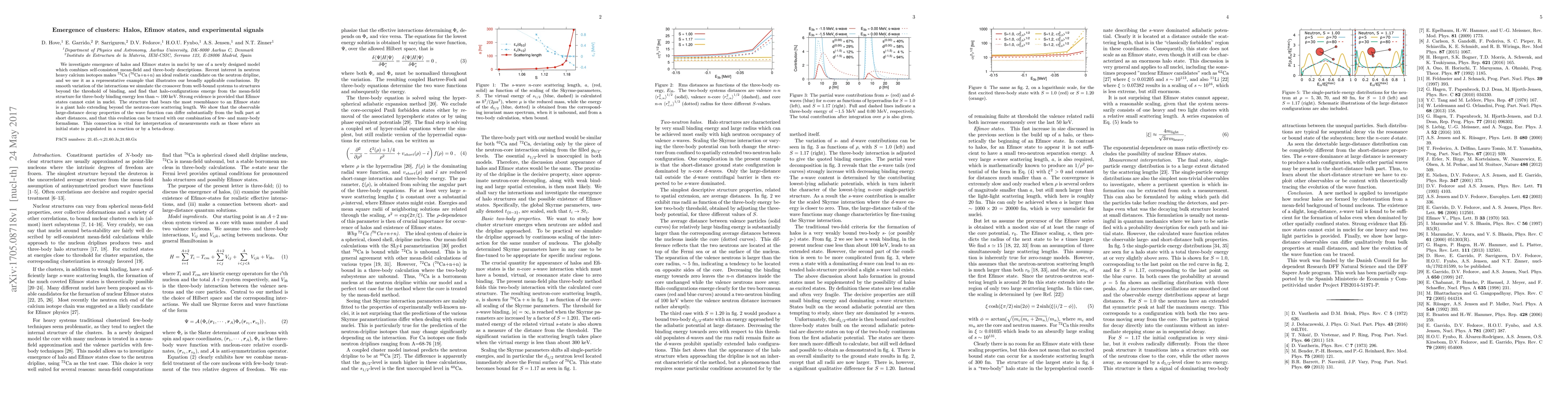 We investigate emergence of halos and Efimov states in nuclei by use of a newly designed model which combines self-consistent mean-field and three-body descriptions. Recent interest in neutron heavy calcium isotopes makes $^{72}$Ca ($^{70}$Ca+n+n) an ideal realistic candidate on the neutron dripline, and we use it as a representative example that illustrates our broadly applicable conclusions. By smooth variation of the interactions we simulate the crossover from well-bound systems to structures beyond the threshold of binding, and find that halo-configurations emerge from the mean-field structure for three-body binding energy less than $\sim 100$keV. Strong evidence is provided that Efimov states cannot exist in nuclei. The structure that bears the most resemblance to an Efimov state is a giant halo extending beyond the neutron-core scattering length. We show that the observable large-distance decay properties of the wave function can differ substantially from the bulk part at short distances, and that this evolution can be traced with our combination of few- and many-body formalisms. This connection is vital for interpretation of measurements such as those where an initial state is populated in a reaction or by a beta-decay.