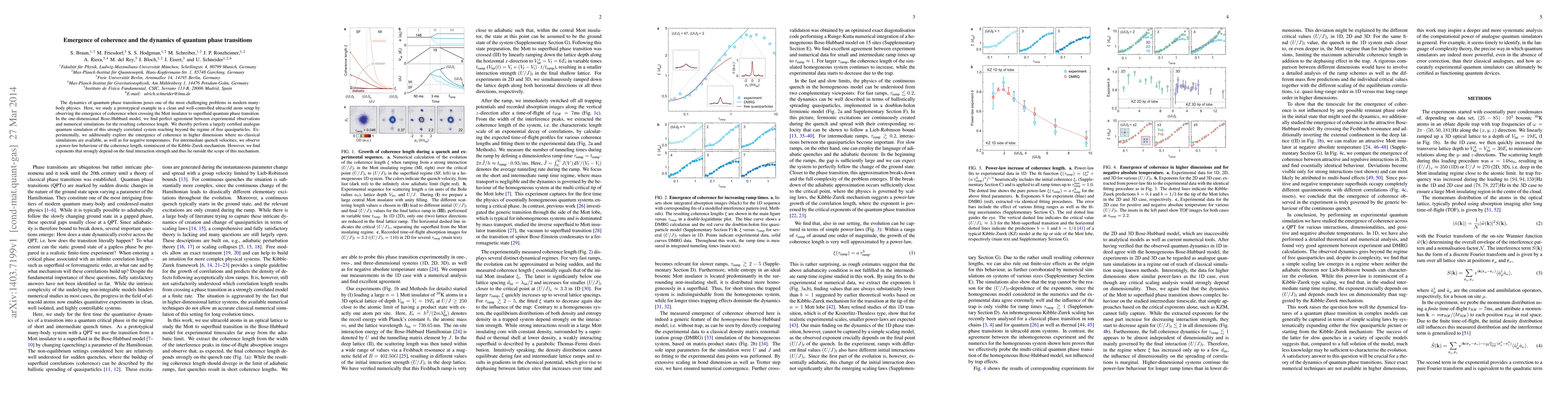 This paper investigates the dynamics of quantum phase transitions in ultracold atoms, focusing on the emergence of coherence during the transition from a Mott insulator to a superfluid. Experimental results in one-dimensional systems match numerical simulations, demonstrating a certified analogue quantum simulation. The study also explores coherence in higher dimensions and negative temperatures, revealing a power-law behavior of coherence length influenced by final interaction strength.