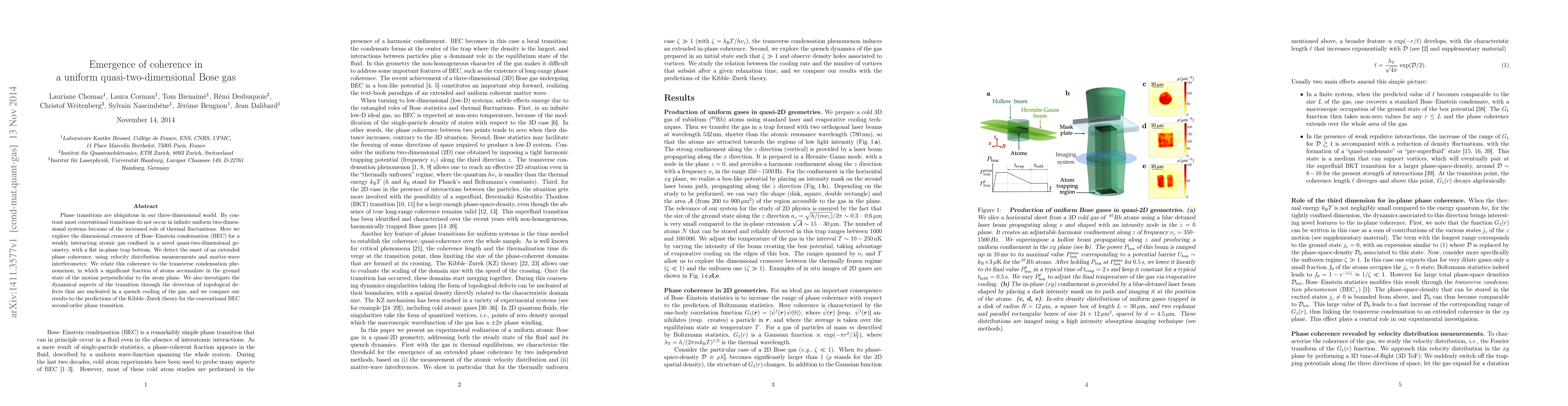 This research investigates Bose-Einstein condensation (BEC) in a weakly interacting atomic gas confined in a quasi-two-dimensional geometry. The study detects the onset of extended phase coherence linked to transverse condensation, and explores dynamical aspects of the transition through topological defect detection, comparing findings to Kibble-Zurek theory.