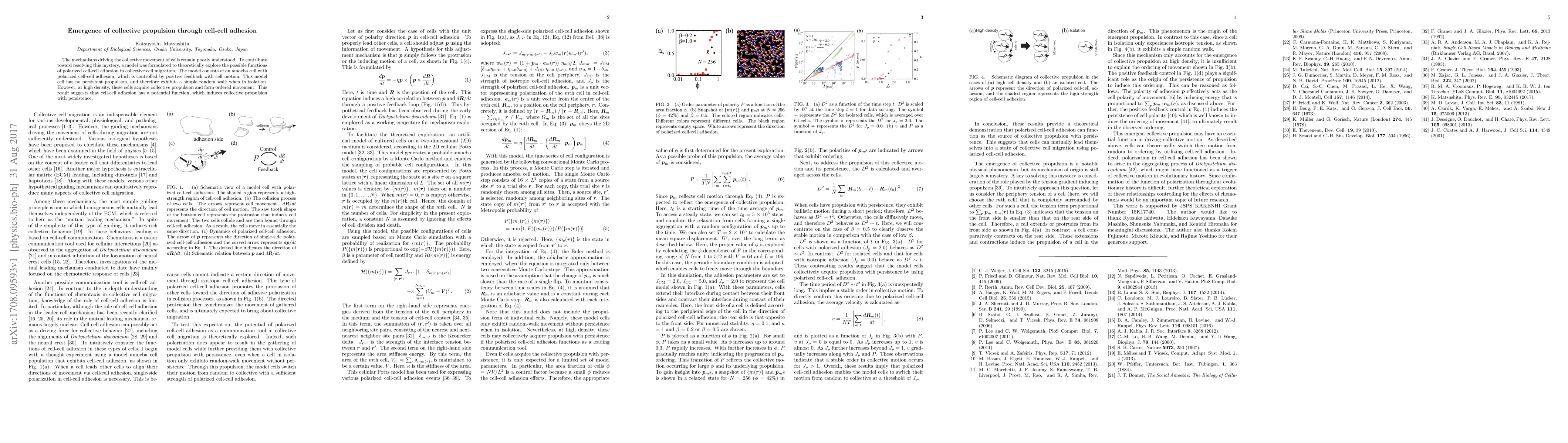 The paper explores a theoretical model of amoeba cells with polarized cell-cell adhesion, revealing that while individual cells exhibit random motion, high-density interactions lead to collective propulsion and ordered movement, suggesting a role for cell-cell adhesion in driving group dynamics.