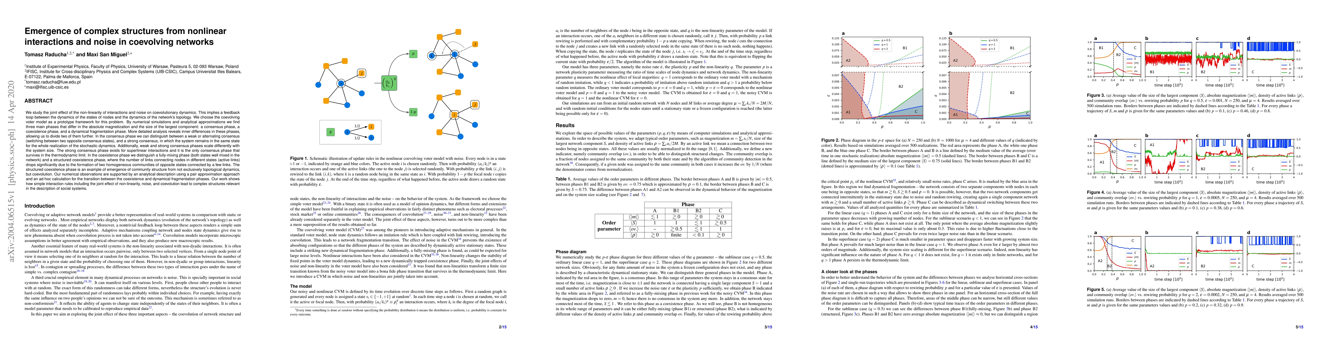 We study the joint effect of the non-linearity of interactions and noise on coevolutionary dynamics. We choose the coevolving voter model as a prototype framework for this problem. By numerical simulations and analytical approximations we find three main phases that differ in the absolute magnetization and the size of the largest component: a consensus phase, a coexistence phase, and a dynamical fragmentation phase. More detailed analysis reveals inner differences in these phases, allowing us to divide two of them further. In the consensus phase we can distinguish between a weak or alternating consensus (switching between two opposite consensus states), and a strong consensus, in which the system remains in the same state for the whole realization of the stochastic dynamics. Additionally, weak and strong consensus phases scale differently with the system size. The strong consensus phase exists for superlinear interactions and it is the only consensus phase that survives in the thermodynamic limit. In the coexistence phase we distinguish a fully-mixing phase (both states well mixed in the network) and a structured coexistence phase, where the number of links connecting nodes in different states (active links) drops significantly due to the formation of two homogeneous communities of opposite states connected by a few links. The structured coexistence phase is an example of emergence of community structure from not exclusively topological dynamics, but coevolution. Our numerical observations are supported by an analytical description using a pair approximation approach and an ad-hoc calculation for the transition between the coexistence and dynamical fragmentation phases. Our work shows how simple interaction rules including the joint effect of non-linearity, noise, and coevolution lead to complex structures relevant in the description of social systems.