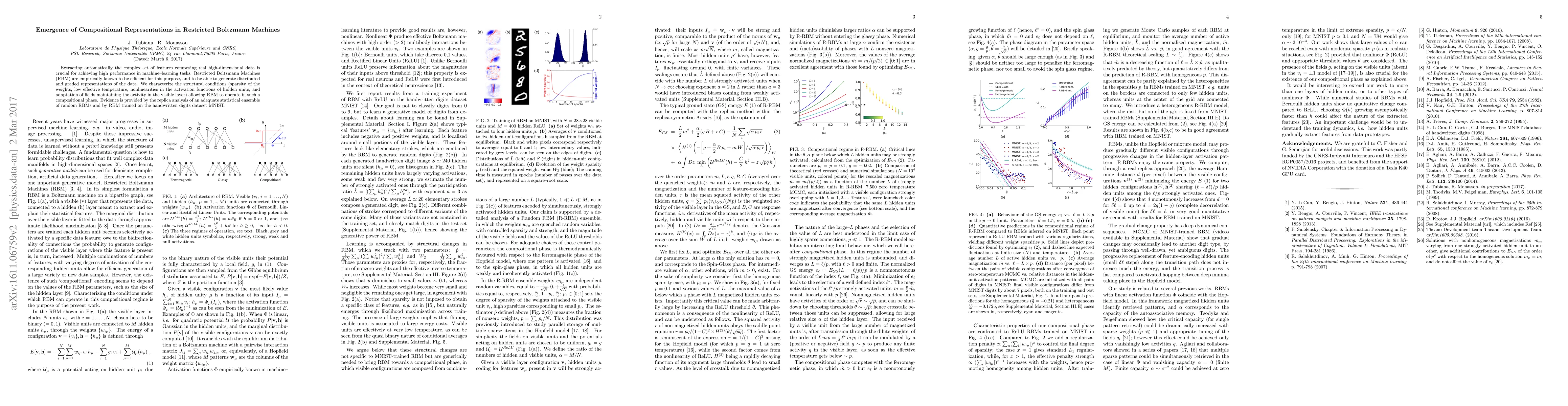 Extracting automatically the complex set of features composing real high-dimensional data is crucial for achieving high performance in machine--learning tasks. Restricted Boltzmann Machines (RBM) are empirically known to be efficient for this purpose, and to be able to generate distributed and graded representations of the data. We characterize the structural conditions (sparsity of the weights, low effective temperature, nonlinearities in the activation functions of hidden units, and adaptation of fields maintaining the activity in the visible layer) allowing RBM to operate in such a compositional phase. Evidence is provided by the replica analysis of an adequate statistical ensemble of random RBMs and by RBM trained on the handwritten digits dataset MNIST.