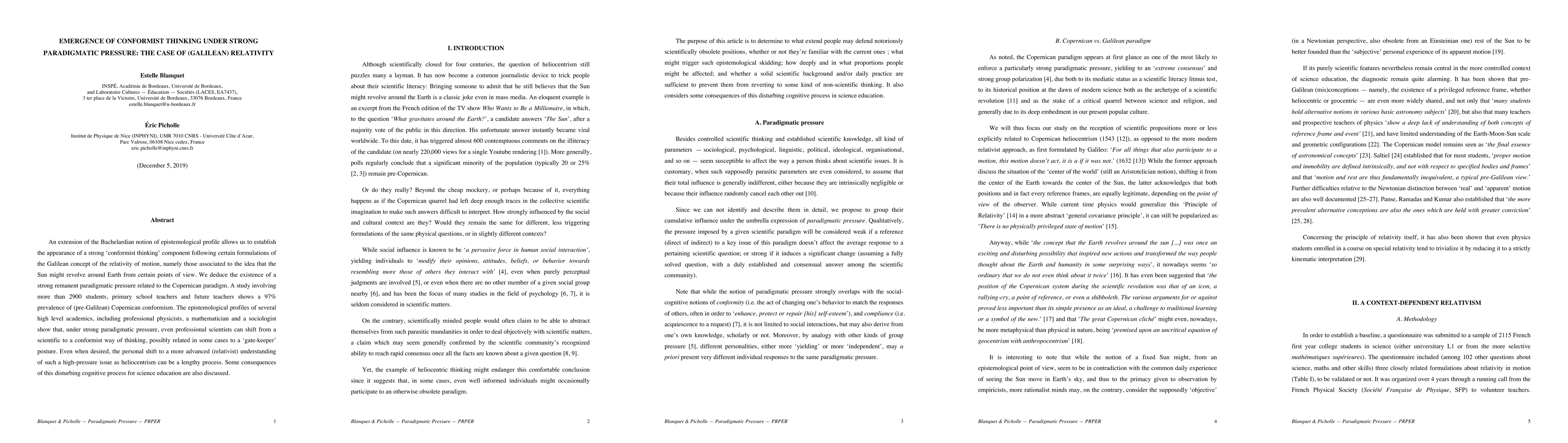 An extension of the Bachelardian notion of epistemological profile allows us to establish the appearance of a strong conformist thinking component following certain formulations of the Galilean concept of the relativity of motion, namely those associated to the idea that the Sun might revolve around Earth from certain points of view. We deduce the existence of a strong remanent paradigmatic pressure related to the Copernican paradigm. A study involving more than 2900 students, primary school teachers and future teachers shows a 97 percent prevalence of (pre-Galilean) Copernican conformism. The epistemological profiles of several high level academics, including professional physicists, a mathematician and a sociologist show that, under strong paradigmatic pressure, even professional scientists can shift from a scientific to a conformist way of thinking, possibly related in some cases to a gate-keeper posture. Even when desired, the personal shift to a more advanced (relativist) understanding of such a high-pressure issue as heliocentrism can be a lengthy process. Some consequences of this disturbing cognitive process for science education are also discussed.