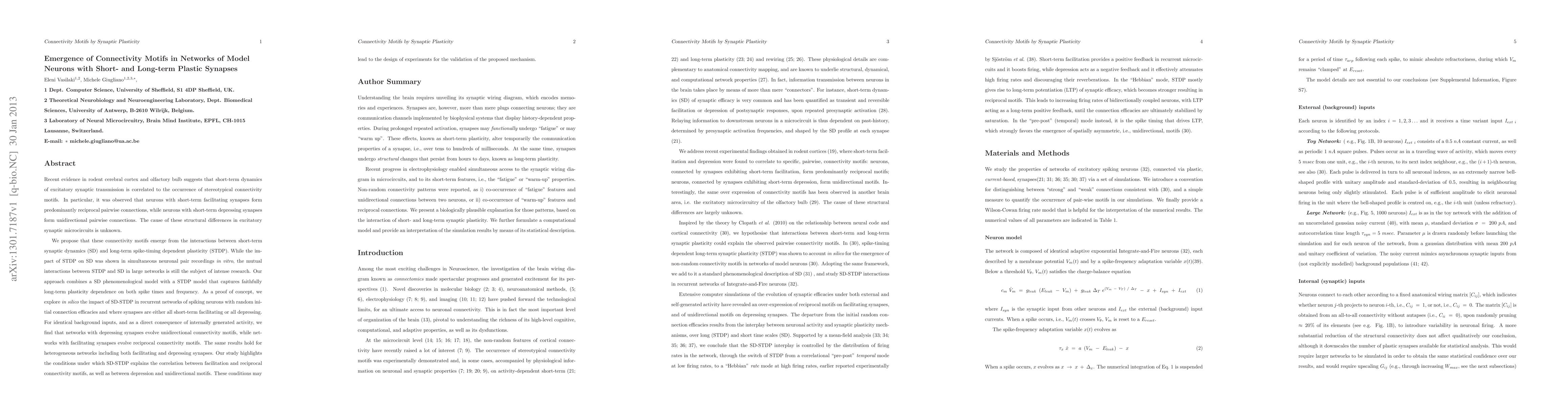 This paper investigates how short-term synaptic dynamics (SD) and long-term spike-timing dependent plasticity (STDP) interact to shape the emergence of connectivity motifs in networks of model neurons. The study finds that facilitating synapses lead to reciprocal connections, while depressing synapses result in unidirectional connections, suggesting a mechanism linking synaptic dynamics and network structure.
