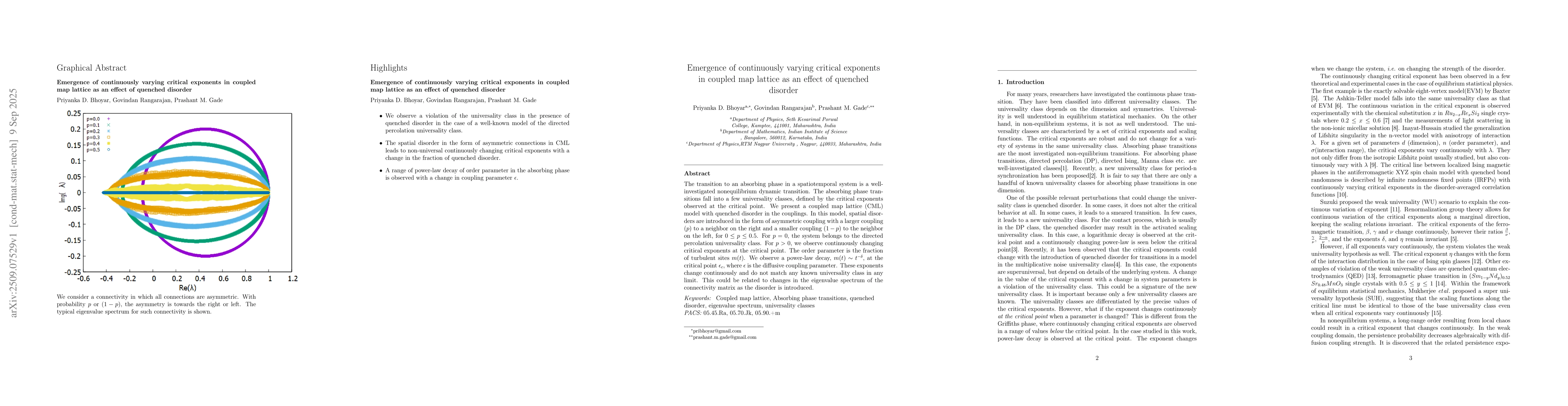 The transition to an absorbing phase in a spatiotemporal system is a well-investigated nonequilibrium dynamic transition. The absorbing phase transitions fall into a few universality classes, defined by the critical exponents observed at the critical point. We present a coupled map lattice (CML) model with quenched disorder in the couplings. In this model, spatial disorders are introduced in the form of asymmetric coupling with a larger coupling ($p$) to a neighbor on the right and a smaller coupling ($1-p$) to the neighbor on the left, for $0 \le p \le0.5$. For $p=0$, the system belongs to the directed percolation universality class. For $p>0$, we observe continuously changing critical exponents at the critical point. The order parameter is the fraction of turbulent sites $m(t)$. %sites that are not in the laminar region. We observe a power-law decay, $m(t) \sim t^{-\delta}$, at the critical point $\epsilon_c$, where $\epsilon$ is the diffusive coupling parameter. These exponents change continuously and do not match any known universality class in any limit. This could be related to changes in the eigenvalue spectrum of the connectivity matrix as the disorder is introduced.