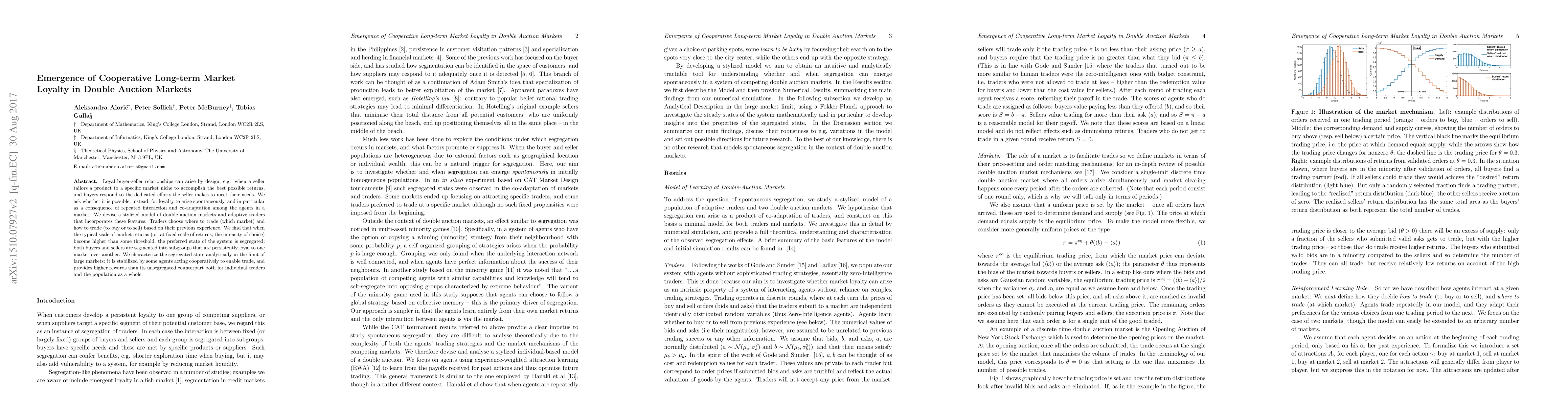 Loyal buyer-seller relationships can arise by design, e.g. when a seller tailors a product to a specific market niche to accomplish the best possible returns, and buyers respond to the dedicated efforts the seller makes to meet their needs. We ask whether it is possible, instead, for loyalty to arise spontaneously, and in particular as a consequence of repeated interaction and co-adaptation among the agents in a market. We devise a stylized model of double auction markets and adaptive traders that incorporates these features. Traders choose where to trade (which market) and how to trade (to buy or to sell) based on their previous experience. We find that when the typical scale of market returns (or, at fixed scale of returns, the intensity of choice) become higher than some threshold, the preferred state of the system is segregated: both buyers and sellers are segmented into subgroups that are persistently loyal to one market over another. We characterize the segregated state analytically in the limit of large markets: it is stabilized by some agents acting cooperatively to enable trade, and provides higher rewards than its unsegregated counterpart both for individual traders and the population as a whole.