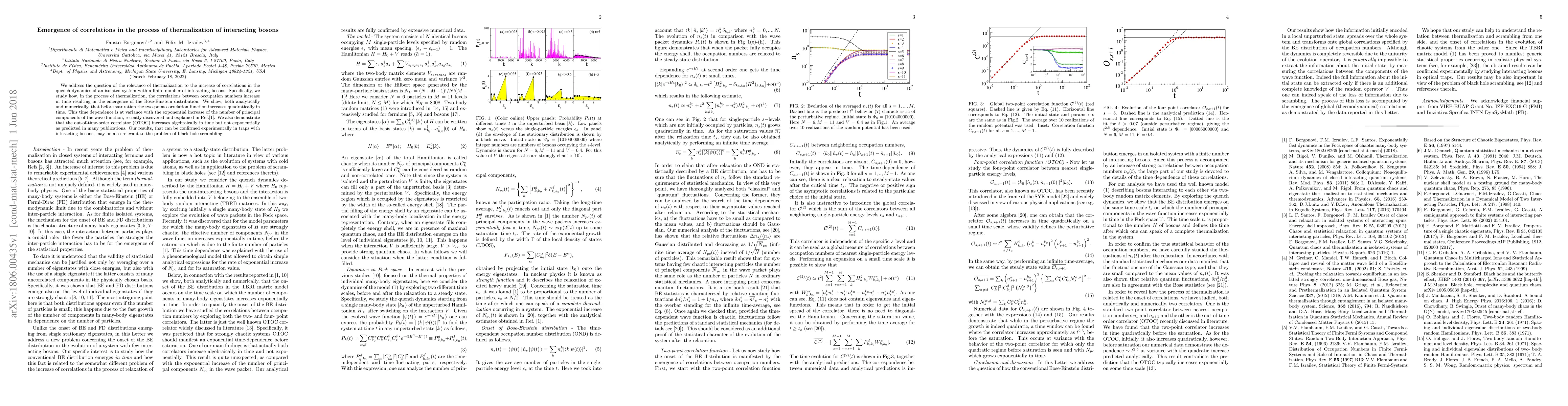 We address the question of the relevance of thermalization to the increase of correlations in the quench dynamics of an isolated system with a finite number of interacting bosons. Specifically, we study how, in the process of thermalization, the correlations between occupation numbers increase in time resulting in the emergence of the Bose-Einstein distribution. We show, both analytically and numerically, that before saturation the two-point correlation function increases quadratically in time. This time dependence is at variance with the exponential increase of the number of principal components of the wave function, recently discovered and explained in Ref.\cite{BIS18}. We also demonstrate that the out-of-time-order correlator (OTOC) increases algebraically in time but not exponentially as predicted in many publications. Our results, that can be confirmed experimentally in traps with interacting bosons, may be also relevant to the problem of black hole scrambling.