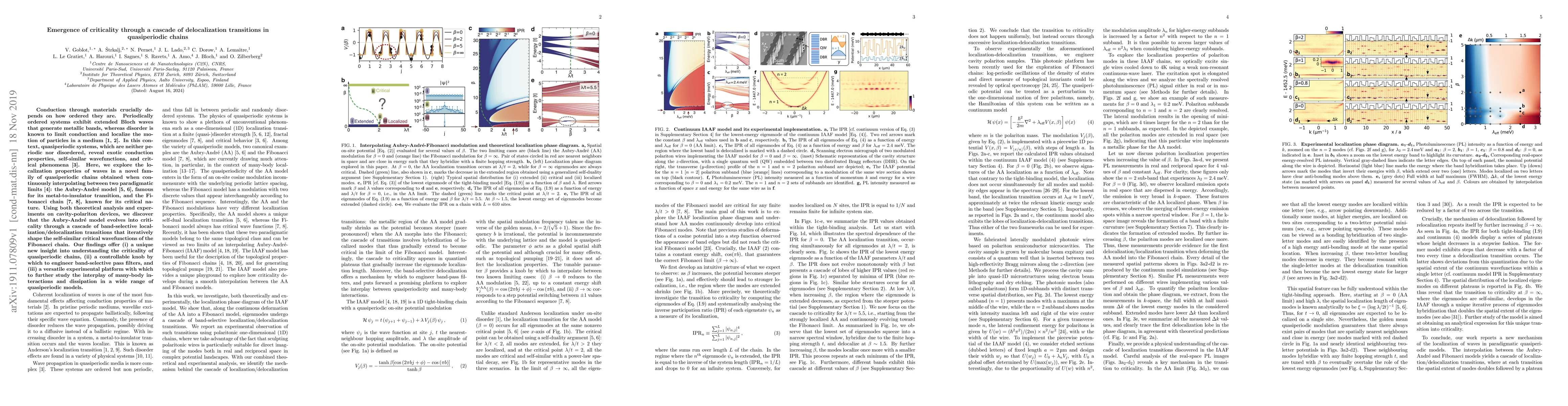 Conduction through materials crucially depends on how ordered they are. Periodically ordered systems exhibit extended Bloch waves that generate metallic bands, whereas disorder is known to limit conduction and localize the motion of particles in a medium. In this context, quasiperiodic systems, which are neither periodic nor disordered, reveal exotic conduction properties, self-similar wavefunctions, and critical phenomena. Here, we explore the localization properties of waves in a novel family of quasiperiodic chains obtained when continuously interpolating between two paradigmatic limits: the Aubry-Andr\'e model, famous for its metal-to-insulator transition, and the Fibonacci chain, known for its critical nature. Using both theoretical analysis and experiments on cavity-polariton devices, we discover that the Aubry-Andr\'e model evolves into criticality through a cascade of band-selective localization/delocalization transitions that iteratively shape the self-similar critical wavefunctions of the Fibonacci chain. Our findings offer (i) a unique new insight into understanding the criticality of quasiperiodic chains, (ii) a controllable knob by which to engineer band-selective pass filters, and (iii) a versatile experimental platform with which to further study the interplay of many-body interactions and dissipation in a wide range of quasiperiodic models.