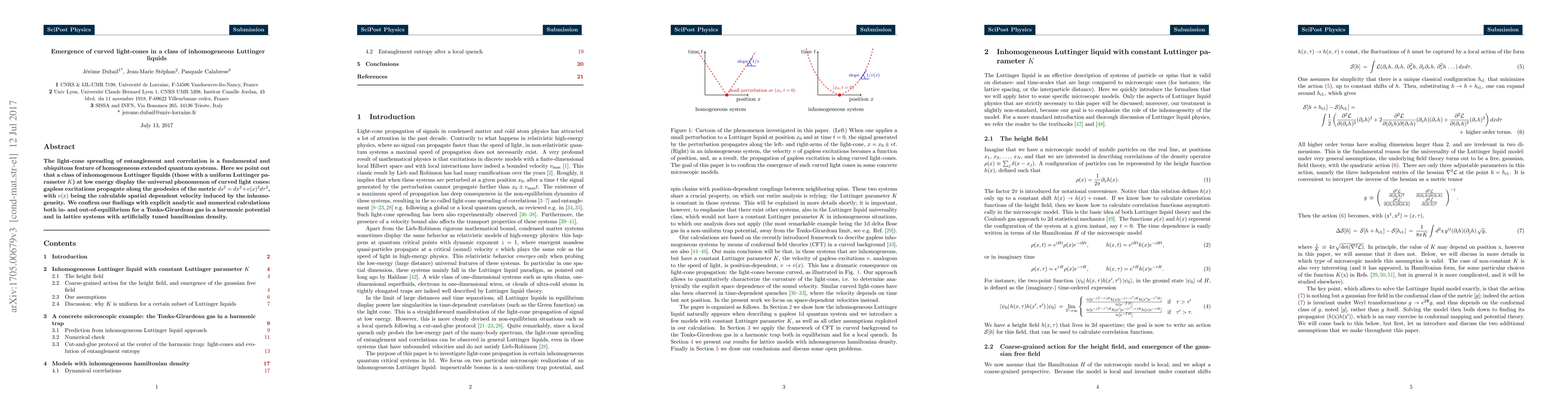 The light-cone spreading of entanglement and correlation is a fundamental and ubiquitous feature of homogeneous extended quantum systems. Here we point out that a class of inhomogenous Luttinger liquids (those with a uniform Luttinger parameter $K$) at low energy display the universal phenomenon of curved light cones: gapless excitations propagate along the geodesics of the metric $ds^2=dx^2+v(x)^2 d\tau^2$, with $v(x)$ being the calculable spatial dependent velocity induced by the inhomogeneity. We confirm our findings with explicit analytic and numerical calculations both in- and out-of-equilibrium for a Tonks-Girardeau gas in a harmonic potential and in lattice systems with artificially tuned hamiltonian density.
