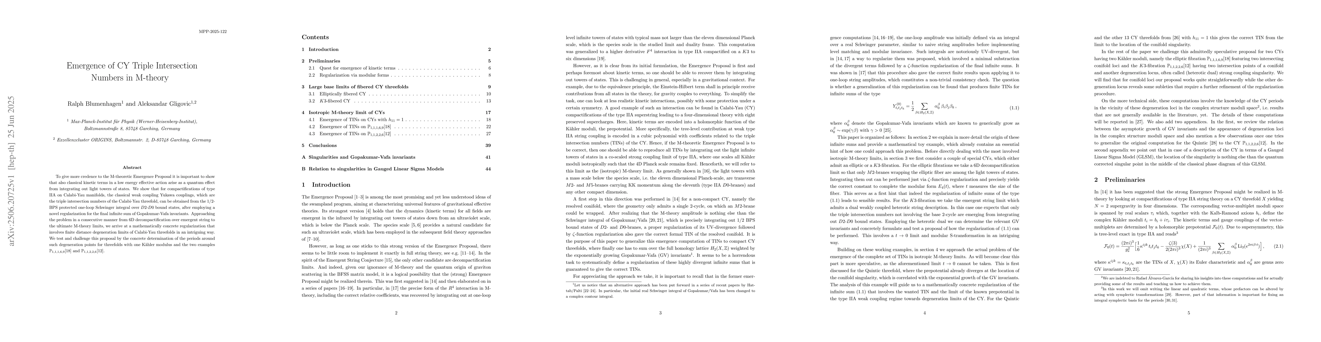 To give more credence to the M-theoretic Emergence Proposal it is important to show that also classical kinetic terms in a low energy effective action arise as a quantum effect from integrating out light towers of states. We show that for compactifications of type IIA on Calabi-Yau manifolds, the classical weak coupling Yukawa couplings, which are the triple intersection numbers of the Calabi-Yau threefold, can be obtained from the 1/2-BPS protected one-loop Schwinger integral over $D2$-$D0$ bound states, after employing a novel regularization for the final infinite sum of Gopakumar-Vafa invariants. Approaching the problem in a consecutive manner from 6D decompactification over emergent string to the ultimate M-theory limits, we arrive at a mathematically concrete regularization that involves finite distance degeneration limits of Calabi-Yau threefolds in an intriguing way. We test and challenge this proposal by the concrete determination of the periods around such degeneration points for threefolds with one K\"ahler modulus and the two examples $\mathbb P_{1,1,1,6,9}[18]$ and $\mathbb P_{1,1,2,2,6}[12]$.
