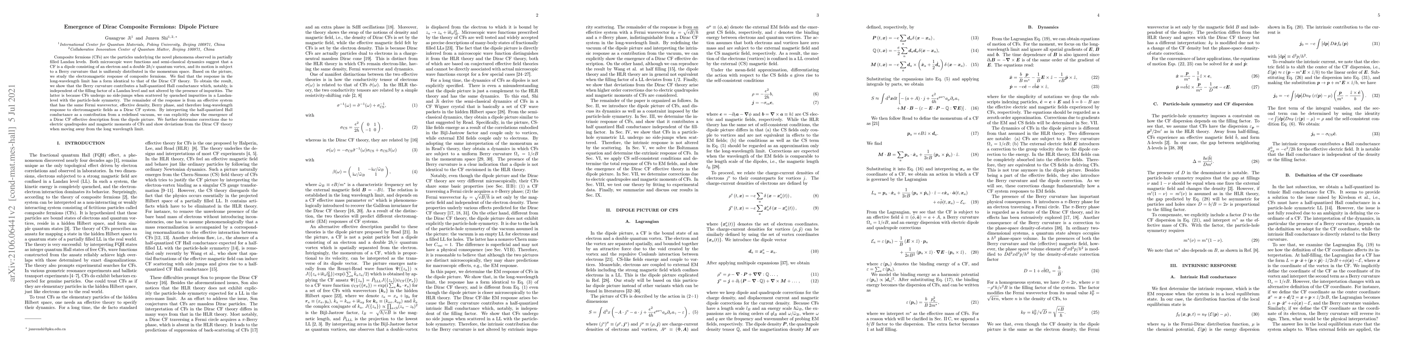 The paper presents a novel interpretation of composite fermions as dipoles and demonstrates how this picture leads to an effective Dirac CF description, contributing to the understanding of strongly correlated electron systems.