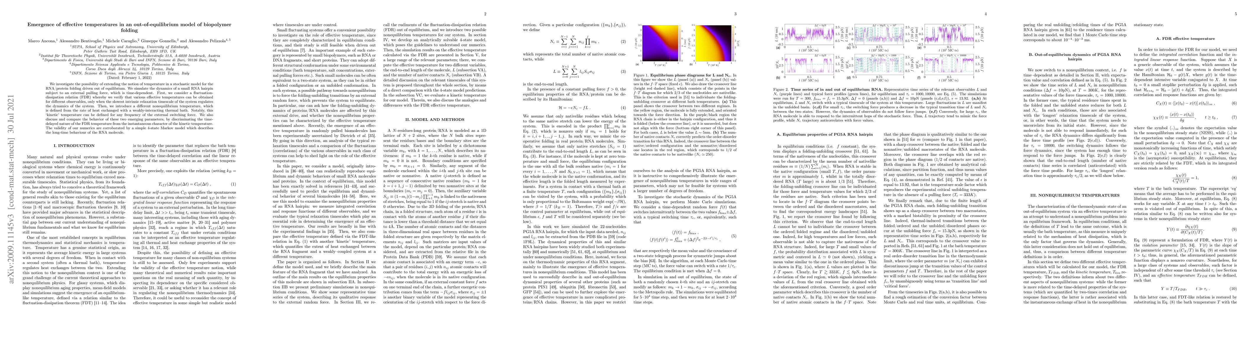 This paper explores the concept of effective temperatures in an out-of-equilibrium model of RNA/protein folding, demonstrating the emergence of two distinct temperature measures: a fluctuation-dissipation relation (FDR) temperature and a kinetic temperature defined by heat exchange rate. The study highlights the differences between these parameters, emphasizing the time-delayed nature of the FDR temperature versus the instantaneous kinetic temperature.