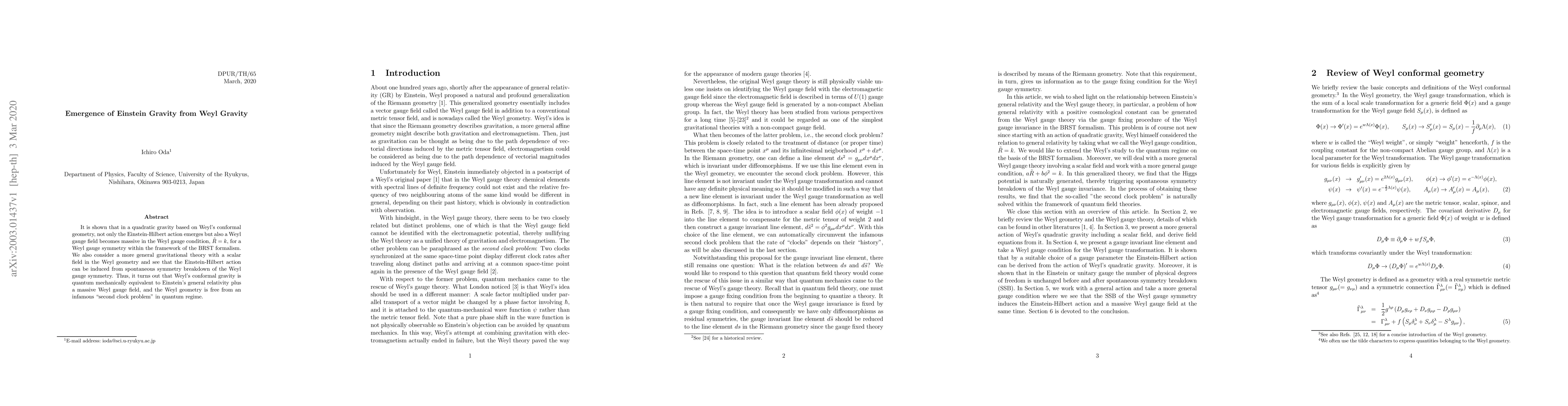 This paper demonstrates that Einstein gravity can emerge from Weyl's conformal geometry through a quadratic gravity framework, where a Weyl gauge field becomes massive under specific conditions. It also shows that the Einstein-Hilbert action arises from the spontaneous symmetry breakdown of the Weyl gauge symmetry, rendering Weyl's conformal gravity equivalent to Einstein's general relativity plus a massive Weyl gauge field, without encountering the "second clock problem."