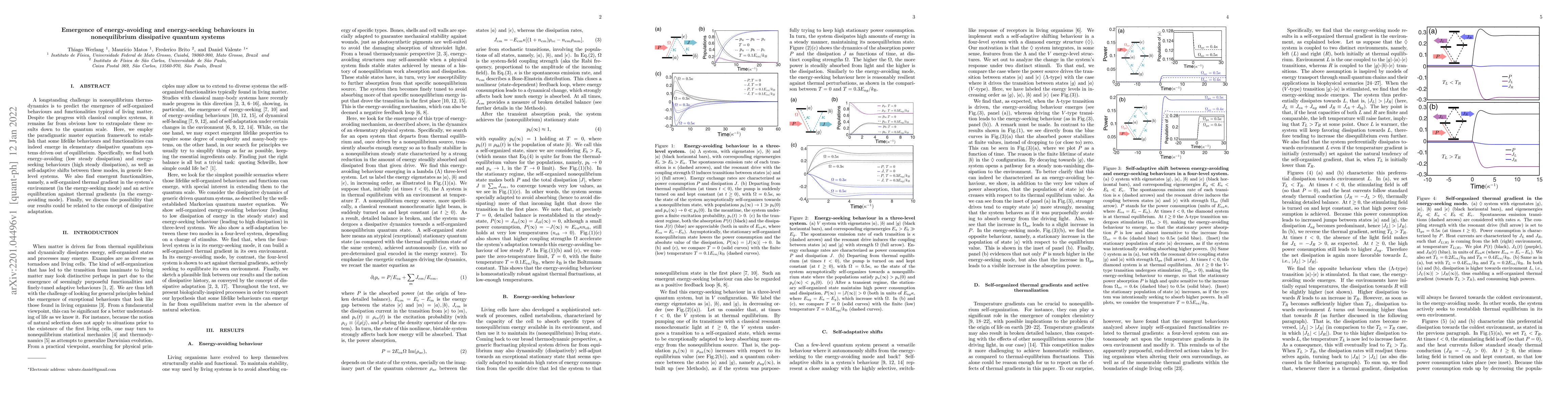 This paper explores the emergence of self-organized energy-avoiding and energy-seeking behaviours in nonequilibrium dissipative quantum systems, demonstrating that such lifelike functionalities can arise in elementary quantum systems driven out of equilibrium. The study reveals self-adaptive shifts between these modes and emergent functionalities like self-organized thermal gradients and active equilibration.