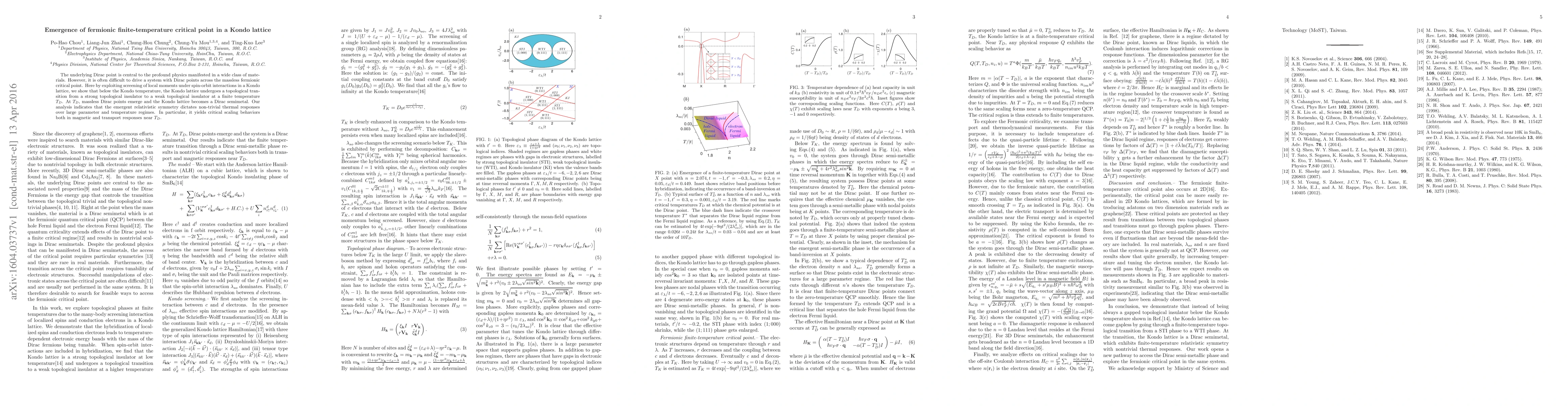 This paper demonstrates the emergence of a fermionic finite-temperature critical point in a Kondo lattice, revealing a topological transition from a strong to a weak topological insulator at a temperature $T_D$. The study highlights the emergence of massless Dirac points and critical scaling behaviors in magnetic and transport responses near $T_D$.