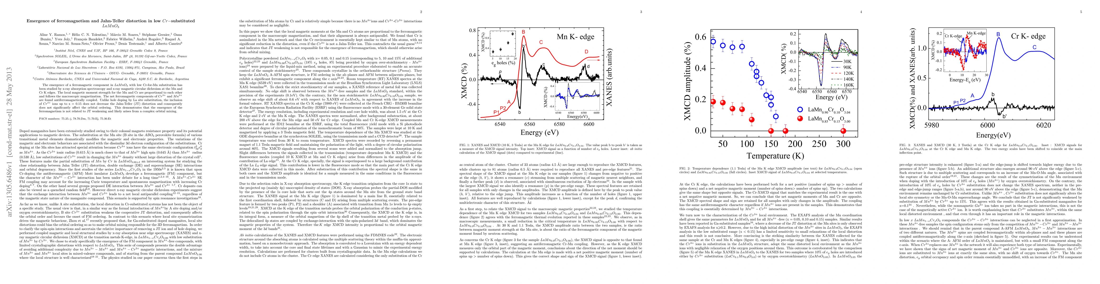 This study investigates the emergence of ferromagnetism in low Cr-substituted $LaMnO_{3}$ using x-ray spectroscopy, revealing a proportional relationship between Mn and Cr local magnetic moments. Contrary to expectations, Cr substitution does not weaken Jahn-Teller distortion, indicating that ferromagnetism likely results from complex orbital mixing rather than JT effects.