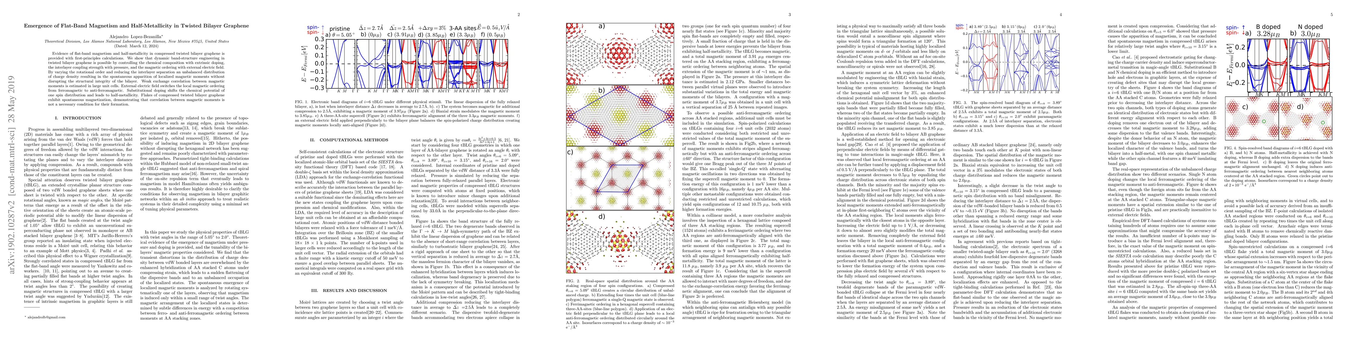 Evidence of flat-band magnetism and half-metallicity in compressed twisted bilayer graphene is provided with first-principles calculations. We show that dynamic band-structure engineering in twisted bilayer graphene is possible by controlling the chemical composition with extrinsic doping, the interlayer coupling strength with pressure, and the magnetic ordering with external electric field. By varying the rotational order and reducing the interlayer separation an unbalanced distribution of charge density resulting in the spontaneous apparition of localized magnetic moments without disrupting the structural integrity of the bilayer. Weak exchange correlation between magnetic moments is estimated in large unit cells. External electric field switches the local magnetic ordering from ferromagnetic to anti-ferromagnetic. Substitutional doping shifts the chemical potential of one spin distribution and leads to half-metallicity. Flakes of compressed twisted bilayer graphene exhibit spontaneous magnetization, demonstrating that correlation between magnetic moments is not a necessary condition for their formation.