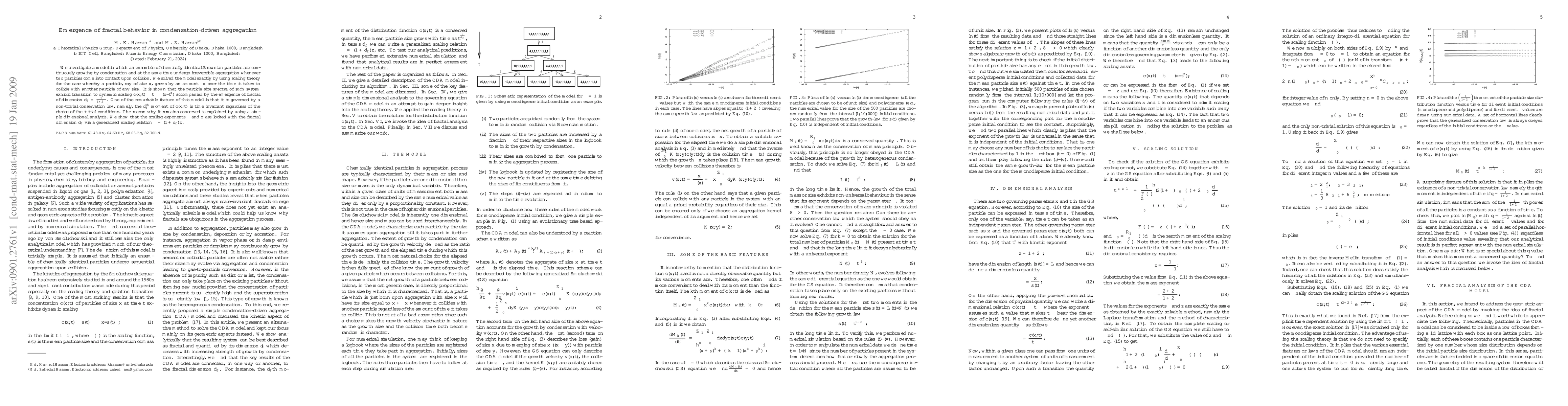 Researchers studied a model of particles that grow through condensation and aggregate when they collide, finding fractal behavior with a specific dimension and conservation law. The study revealed a unique relationship between the scaling exponents and the fractal dimension.