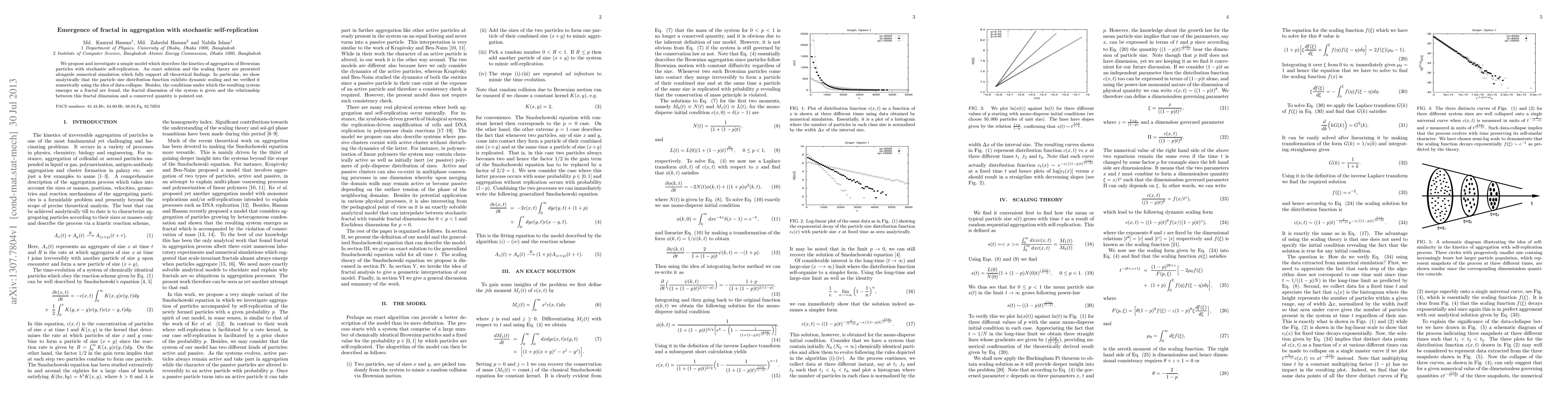 This paper presents a model for Brownian particle aggregation with stochastic self-replication, demonstrating dynamic scaling in the particle size distribution and identifying conditions for fractal emergence. Analytical, scaling theory, and numerical simulations confirm the fractal dimension and its relation to a conserved quantity.