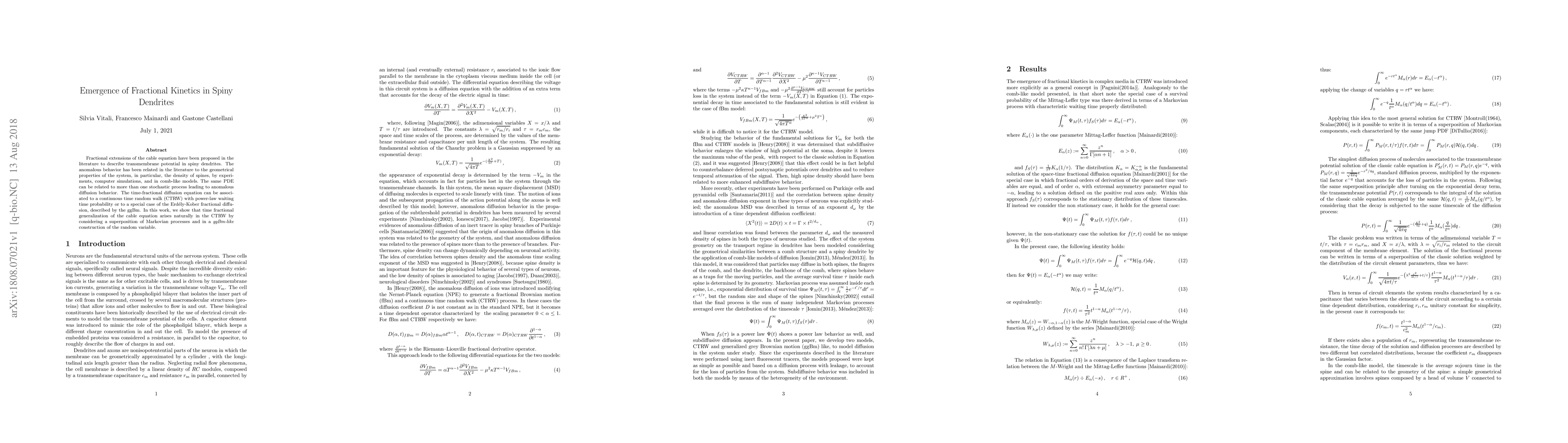 This paper explores the emergence of fractional kinetics in spiny dendrites, demonstrating that the time-fractional generalization of the cable equation naturally arises from a continuous time random walk (CTRW) with power-law waiting times and a ggBm-like construction, linking anomalous diffusion behavior to the geometrical properties of spiny dendrites.