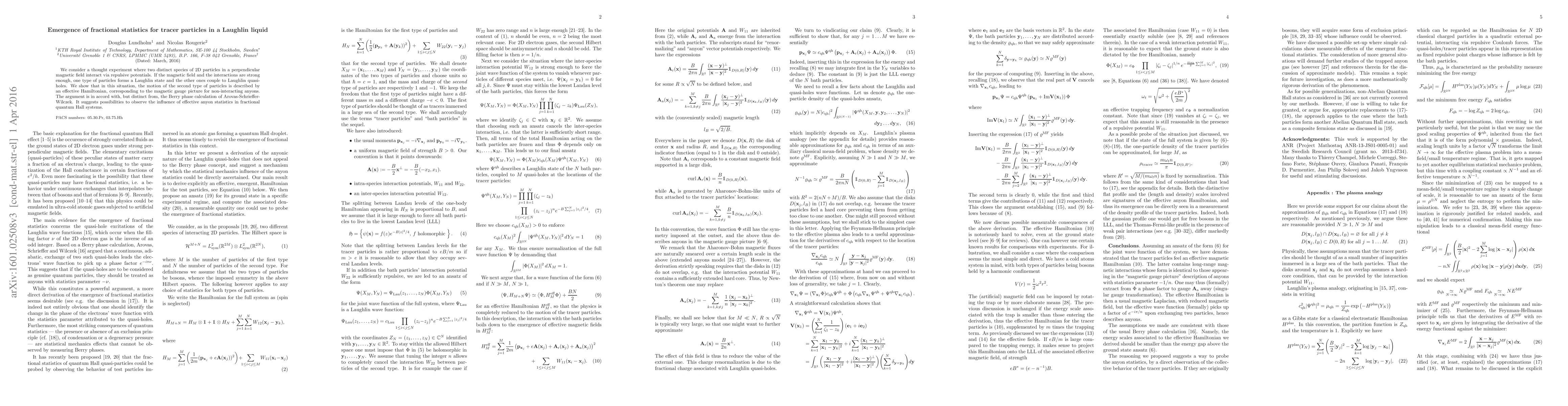 We consider a thought experiment where two distinct species of 2D particles in a perpendicular magnetic field interact via repulsive potentials. If the magnetic field and the interactions are strong enough, one type of particles forms a Laughlin state and the other ones couple to Laughlin quasi-holes. We show that in this situation, the motion of the second type of particles is described by an effective Hamiltonian, corresponding to the magnetic gauge picture for non-interacting anyons. The argument is in accord with, but distinct from, the Berry phase calculation of Arovas-Schrieffer-Wilczek. It suggests possibilities to observe the influence of effective anyon statistics in fractional quantum Hall systems.