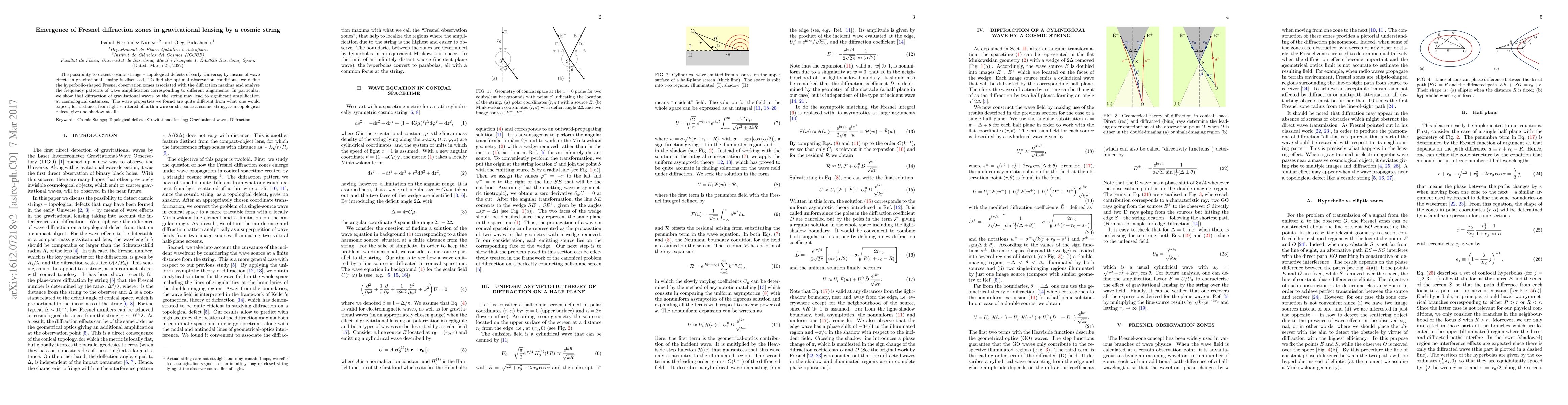 This paper explores the detection of cosmic strings via gravitational lensing and Fresnel diffraction, identifying hyperbolic-shaped observation zones that maximize wave amplification. It reveals that diffraction of gravitational waves by cosmic strings leads to unique amplification patterns, differing significantly from light diffraction due to the absence of shadows cast by these topological defects.