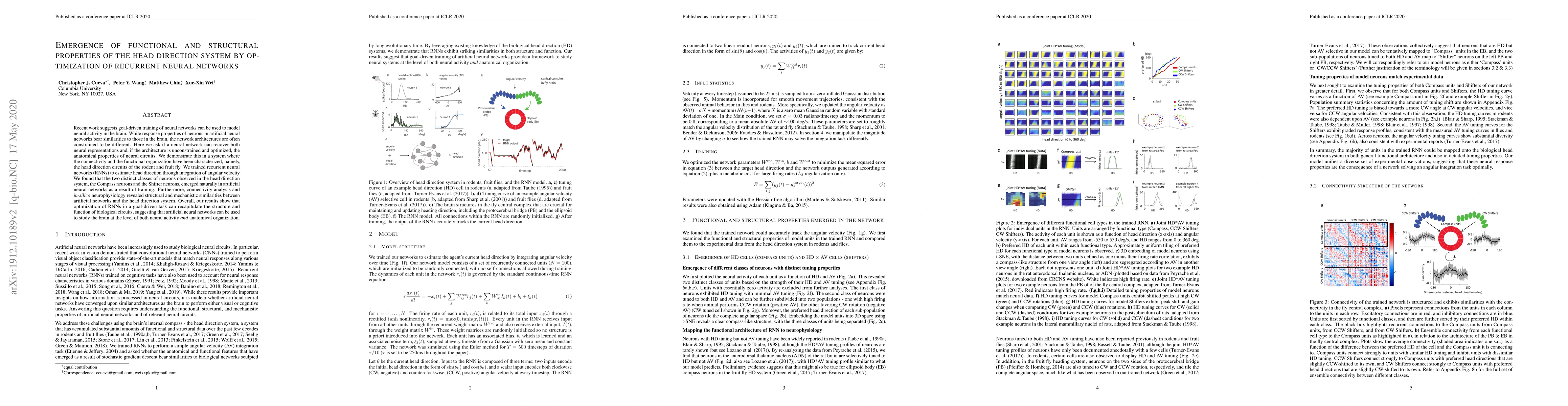 This study demonstrates that goal-driven training of unconstrained recurrent neural networks can naturally produce both the functional and structural properties of the head direction system, mirroring the neural representations and connectivity patterns observed in biological systems like rodents and fruit flies. The findings suggest that artificial neural networks can effectively model brain circuits.