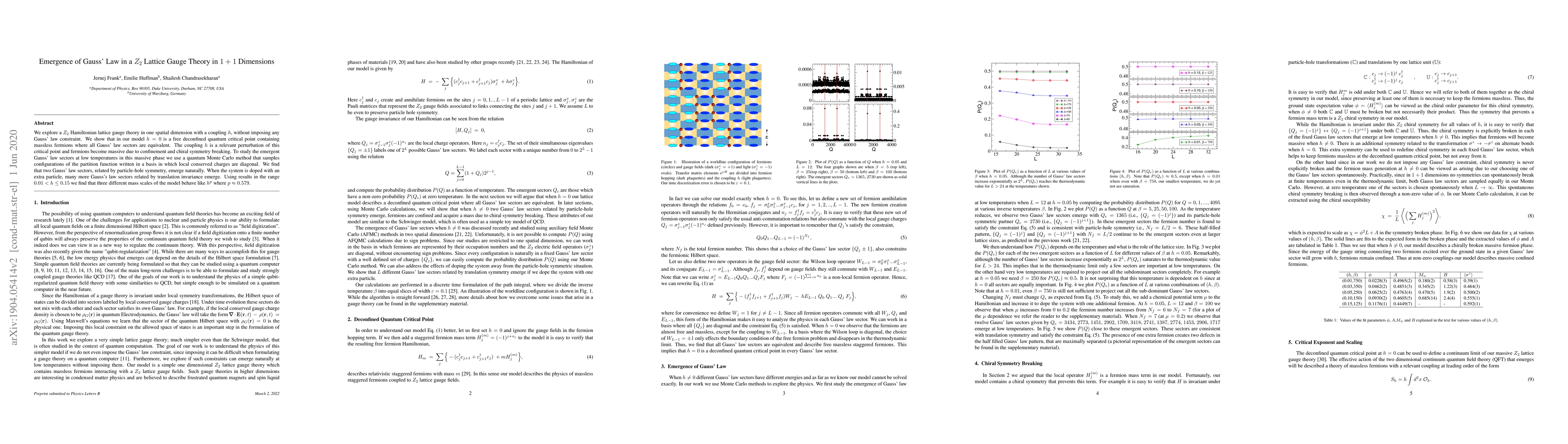 This paper investigates a $Z_2$ lattice gauge theory in one spatial dimension, revealing that $h=0$ is a critical point with equivalent Gauss' law sectors. It demonstrates that a small coupling $h$ leads to confinement and symmetry breaking, and uses quantum Monte Carlo methods to show the emergence of distinct Gauss' law sectors at low temperatures.