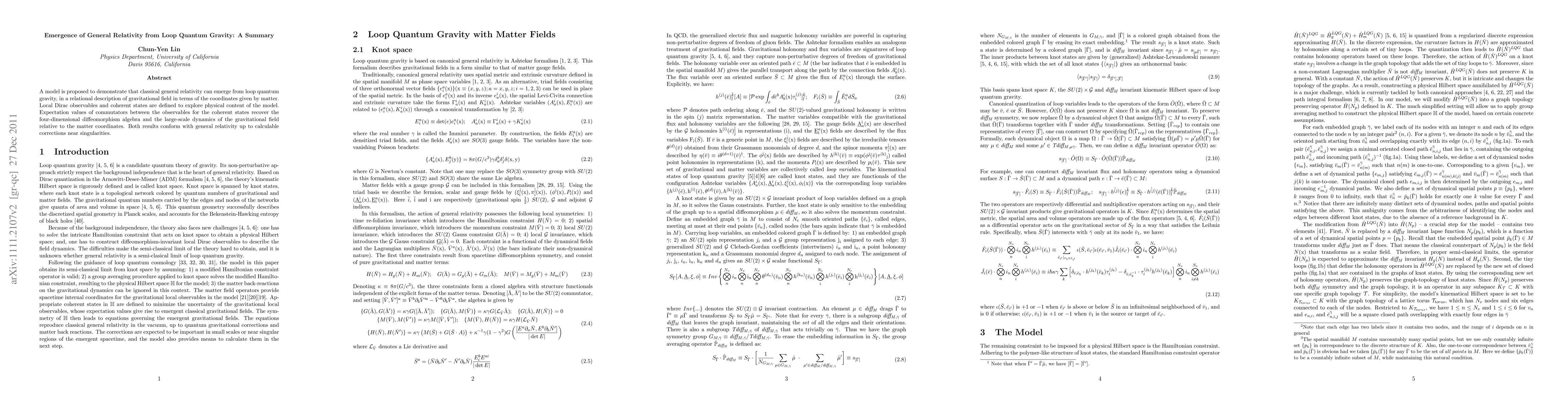 A model is proposed to demonstrate that classical general relativity can emerge from loop quantum gravity, in a relational description of gravitational field in terms of the coordinates given by matter. Local Dirac observables and coherent states are defined to explore physical content of the model. Expectation values of commutators between the observables for the coherent states recover the four-dimensional diffeomorphism algebra and the large-scale dynamics of the gravitational field relative to the matter coordinates. Both results conform with general relativity up to calculable corrections near singularities.