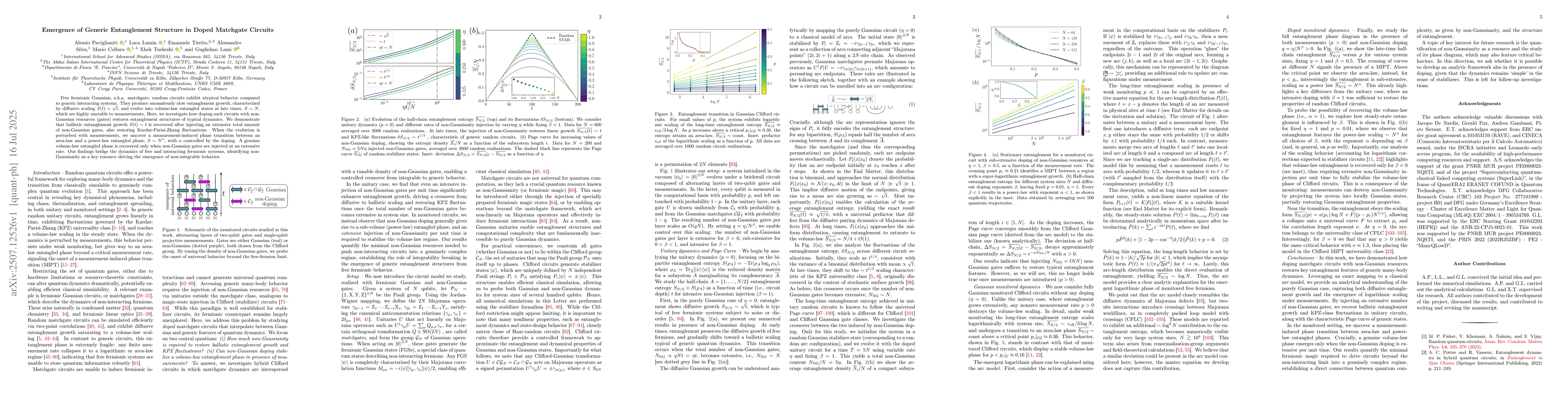 Free fermionic Gaussian, a.k.a. matchgate, random circuits exhibit atypical behavior compared to generic interacting systems. They produce anomalously slow entanglement growth, characterized by diffusive scaling $S(t) \sim \sqrt{t}$, and evolve into volume-law entangled states at late times, $S \sim N$, which are highly unstable to measurements. Here, we investigate how doping such circuits with non-Gaussian resources (gates) restores entanglement structures of typical dynamics. We demonstrate that ballistic entanglement growth $S(t) \sim t$ is recovered after injecting an extensive total amount of non-Gaussian gates, also restoring Kardar-Parisi-Zhang fluctuations. When the evolution is perturbed with measurements, we uncover a measurement-induced phase transition between an area-law and a power-law entangled phase, $S \sim N^\alpha$, with $\alpha$ controlled by the doping. A genuine volume-law entangled phase is recovered only when non-Gaussian gates are injected at an extensive rate. Our findings bridge the dynamics of free and interacting fermionic systems, identifying non-Gaussianity as a key resource driving the emergence of non-integrable behavior.