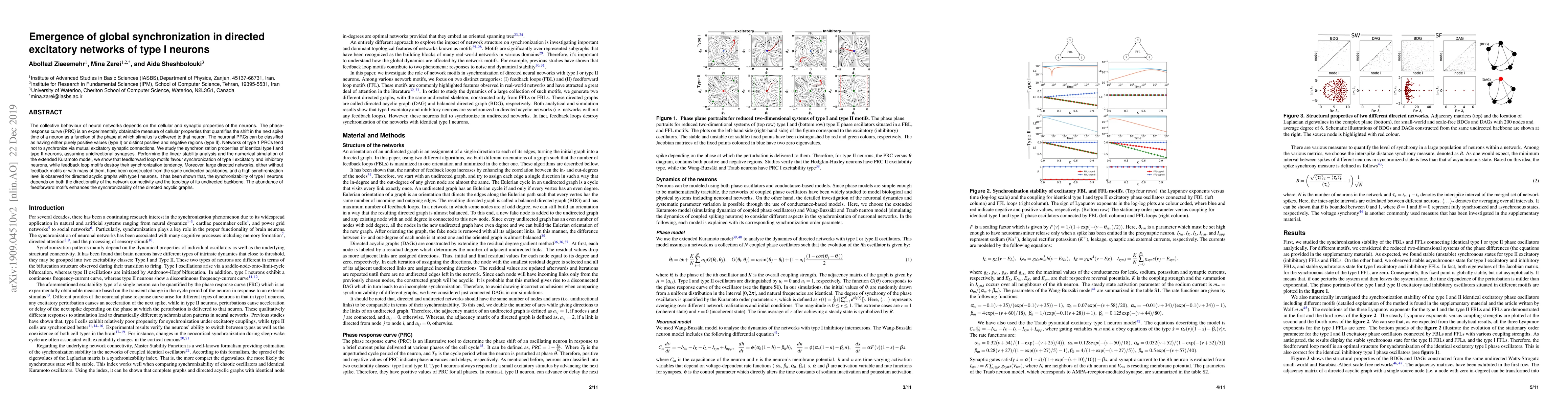 This paper investigates the synchronization dynamics of directed excitatory networks composed of type I neurons, revealing that feedforward loop motifs promote synchronization while feedback loops hinder it. High synchronization levels are observed in directed acyclic graphs with type I neurons, emphasizing the role of network topology and connectivity directionality in synchronizability.