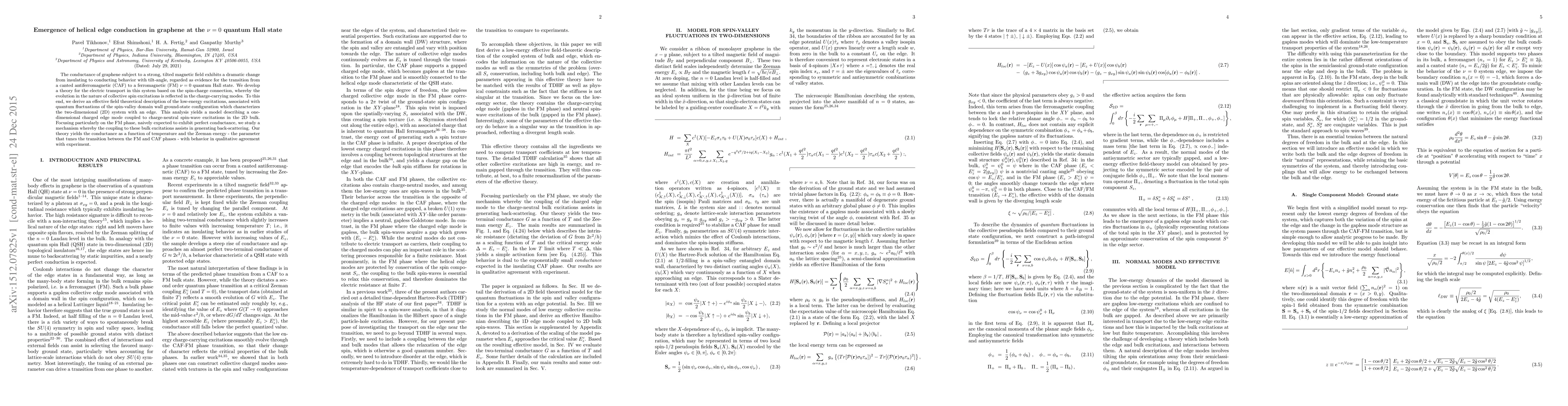 This research paper explores the emergence of helical edge conduction in graphene at the ν=0 quantum Hall state under a strong, tilted magnetic field, revealing a transition from insulating to conducting behavior. The study develops a theoretical framework linking spin-charge dynamics and identifies a mechanism for back-scattering in the ferromagnetic phase, matching experimental observations.