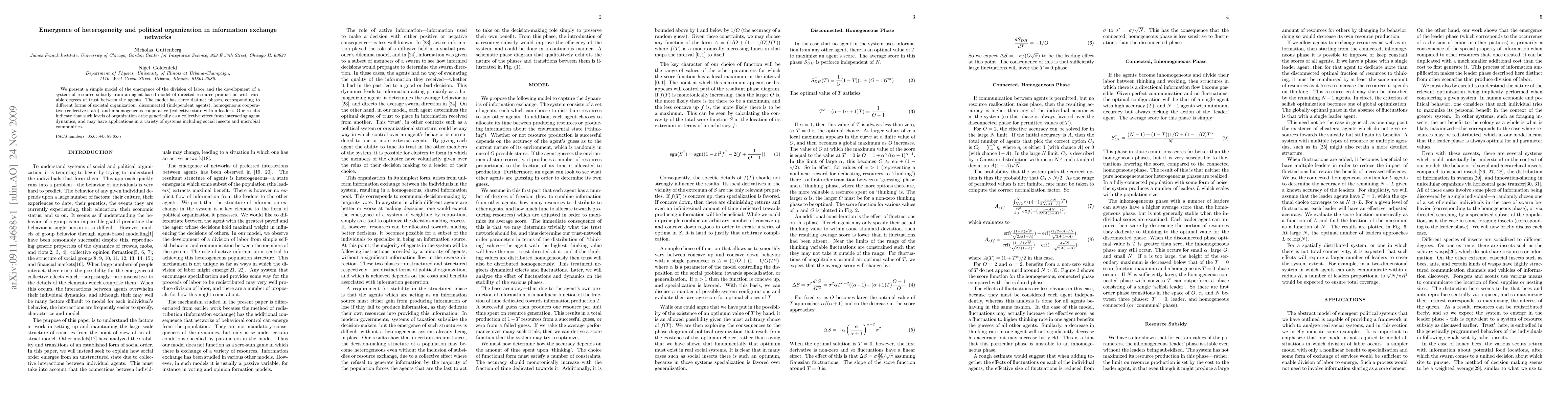This paper presents a model showing how heterogeneity and political organization emerge in information exchange networks, transitioning through phases of disconnected, homogeneous cooperative, and inhomogeneous cooperative states driven by agent interactions and trust levels. The findings suggest these organizational forms arise generically from agent dynamics and can apply to social insects and microbial communities.